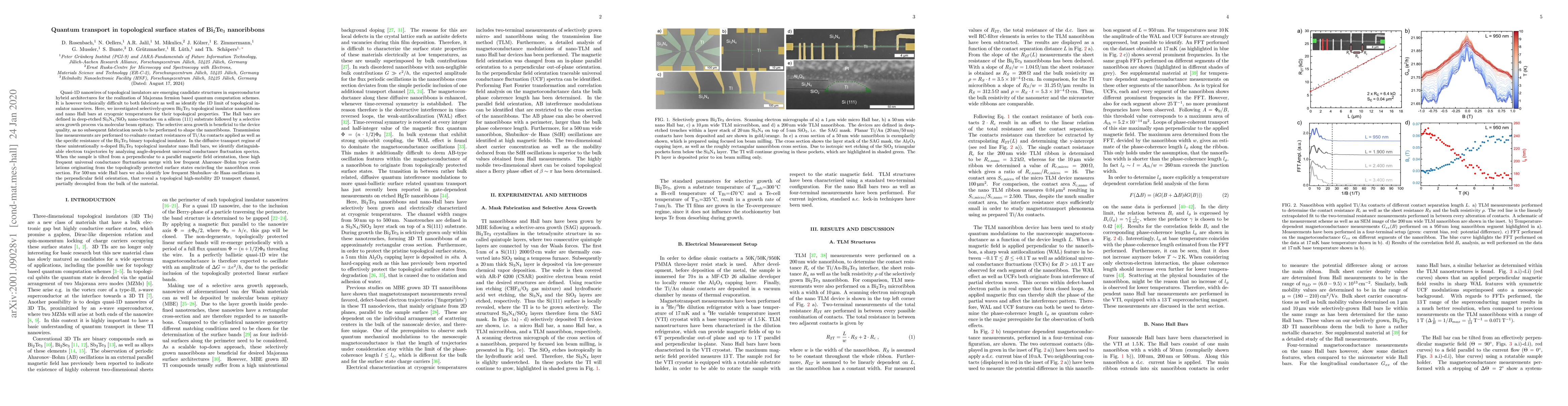 This study investigates Bi$_2$Te$_3$ topological insulator nanoribbons fabricated via selective growth for their quantum transport properties. It identifies distinct electron trajectories and topological surface state oscillations in the diffusive transport regime, revealing a high-mobility 2D transport channel.