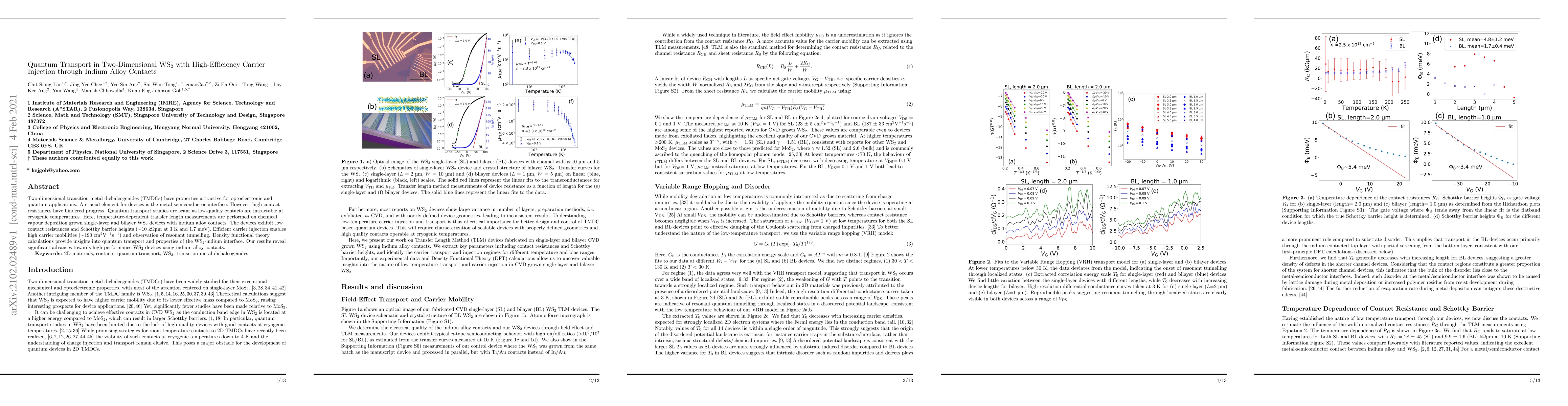 Two-dimensional transition metal dichalcogenides (TMDCs) have properties attractive for optoelectronic and quantum applications. A crucial element for devices is the metal-semiconductor interface. However, high contact resistances have hindered progress. Quantum transport studies are scant as low-quality contacts are intractable at cryogenic temperatures. Here, temperature-dependent transfer length measurements are performed on chemical vapour deposition grown single-layer and bilayer WS$_2$ devices with indium alloy contacts. The devices exhibit low contact resistances and Schottky barrier heights (\sim10 k$\Omega$\si{\micro\metre} at 3 K and 1.7 meV). Efficient carrier injection enables high carrier mobilities ($\sim$190 cm$^2$V$^{-1}$s$^{-1}$) and observation of resonant tunnelling. Density functional theory calculations provide insights into quantum transport and properties of the WS$_2$-indium interface. Our results reveal significant advances towards high-performance WS$_2$ devices using indium alloy contacts.