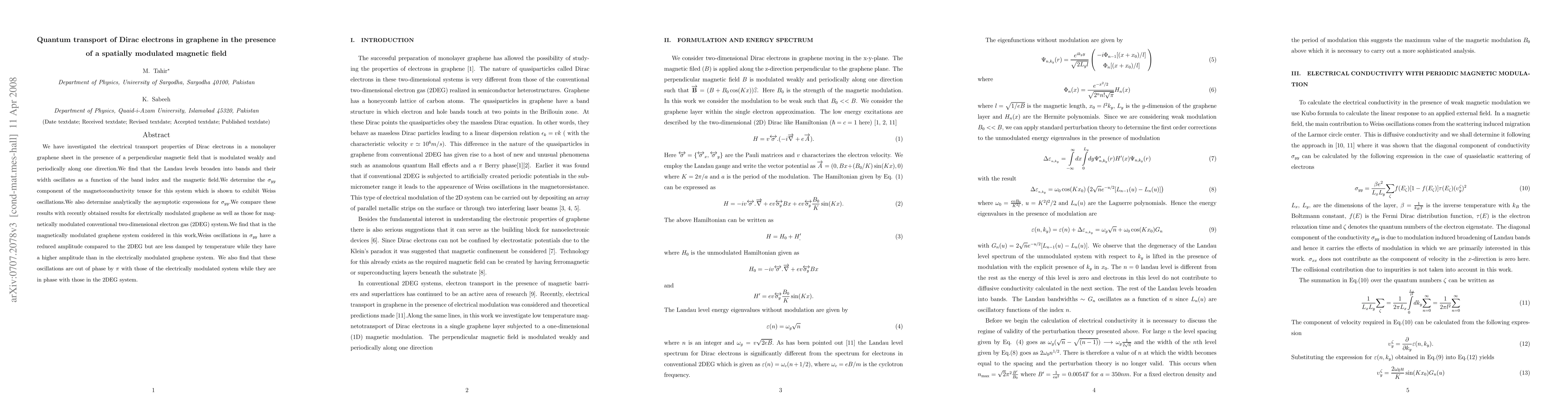 This study explores the quantum transport of Dirac electrons in graphene under a spatially modulated magnetic field, revealing that Landau levels broaden into bands with oscillating widths. The system exhibits Weiss oscillations in the $\sigma_{yy}$ component of the magnetoconductivity tensor, which are less damped by temperature but have reduced amplitude compared to conventional 2DEG systems.