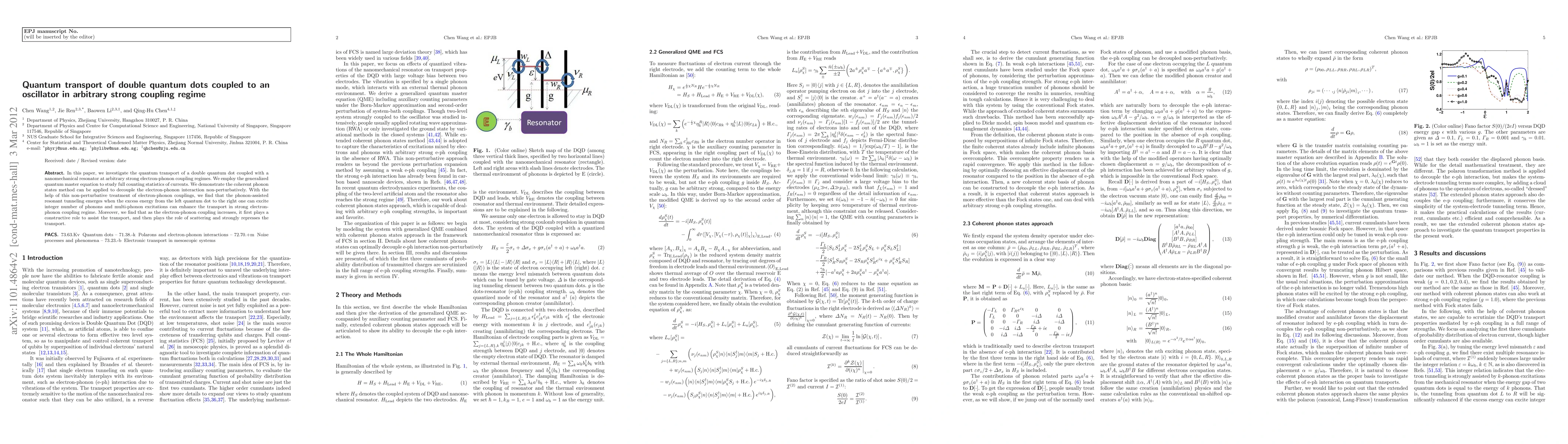 This paper explores quantum transport in double quantum dots linked to a nanomechanical resonator under strong electron-phonon coupling. It uses a generalized quantum master equation to analyze current statistics, revealing phonon-assisted resonant tunneling and the dual role of electron-phonon coupling in enhancing and repressing transport.