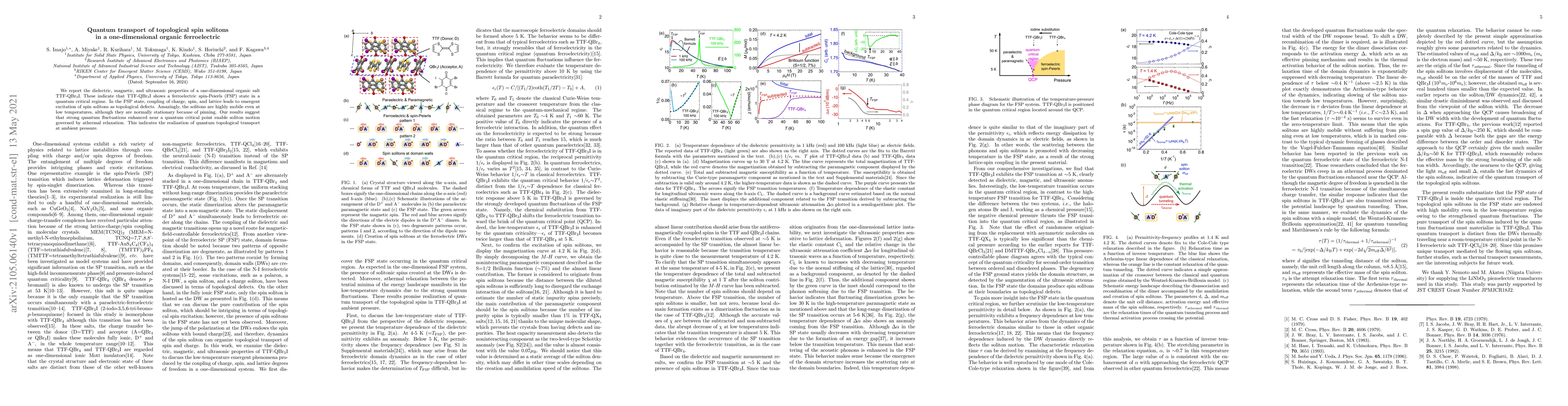 The paper reports on the unique properties of TTF-QBr$_3$I, a one-dimensional organic salt, exhibiting a ferroelectric spin-Peierls state at a quantum critical regime. This leads to mobile spin solitons, or topological defects, at low temperatures, suggesting realization of quantum topological transport at ambient pressure.