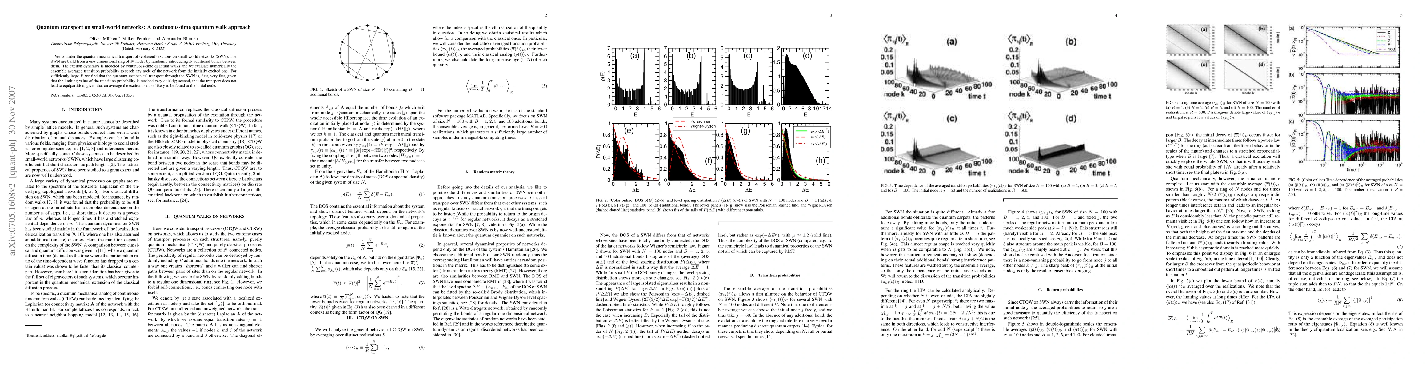 This paper investigates quantum transport of excitons on small-world networks using continuous-time quantum walks, finding that transport is rapid and highly localized near the initial node, rather than evenly distributed across the network.