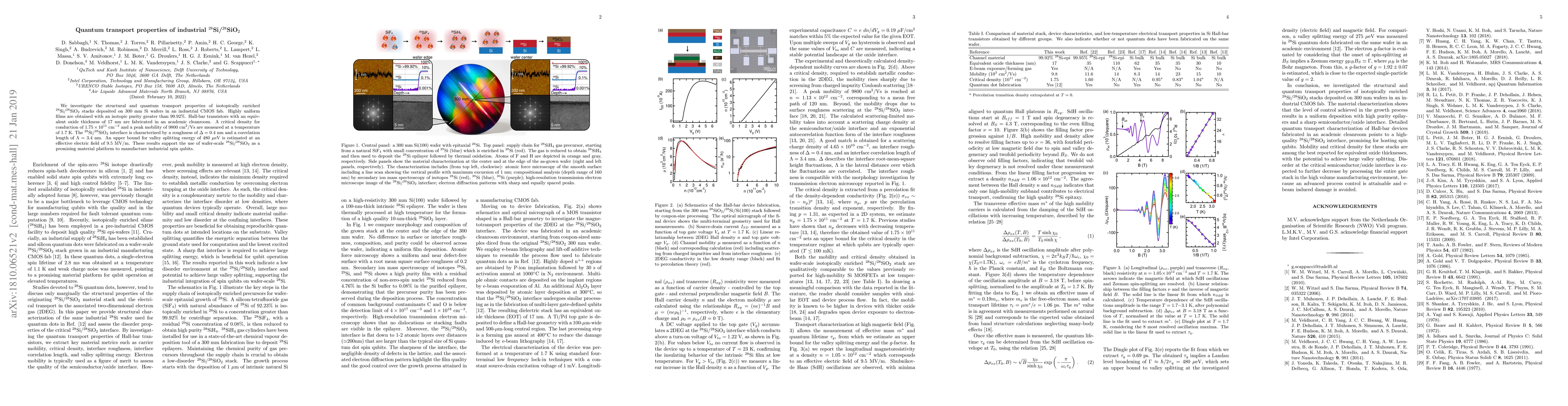 This study investigates the quantum transport properties of isotopically enriched $^{28}$Si/$^{28}$SiO$_2$ stacks, achieving high isotopic purity and uniformity. The research finds a critical conduction density and peak mobility, supporting the material's potential for industrial spin qubit manufacturing.