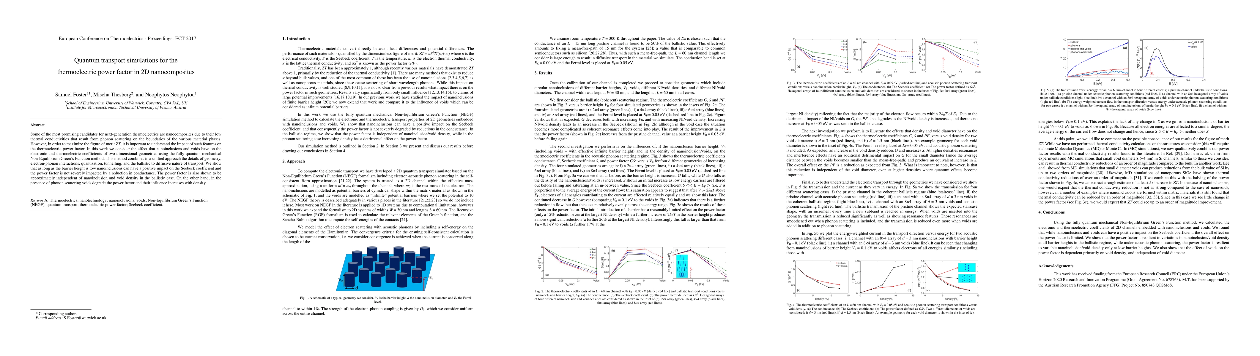 Some of the most promising candidates for next generation thermoelectrics are nanocomposites due to their low thermal conductivities that result from phonon scattering on the boundaries of the various material phases. However, in order to maximize the figure of merit ZT, it is important to understand the impact of such features on the thermoelectric power factor. In this work we consider the effect that nanoinclusions and voids have on the electronic and thermoelectric coefficients of two dimensional geometries using the fully quantum mechanical Non Equilibrium Greens Function method. This method combines in a unified approach the details of geometry, electron phonon interactions, quantisation, tunnelling, and the ballistic to diffusive nature of transport. We show that as long as the barrier height is low nanoinclusions can have a positive impact on the Seebeck coefficient and the power factor is not severely impacted by a reduction in conductance. The power factor is also shown to be approximately independent of nanoinclusion and void density in the ballistic case. On the other hand, in the presence of phonon scattering voids degrade the power factor and their influence increases with density.