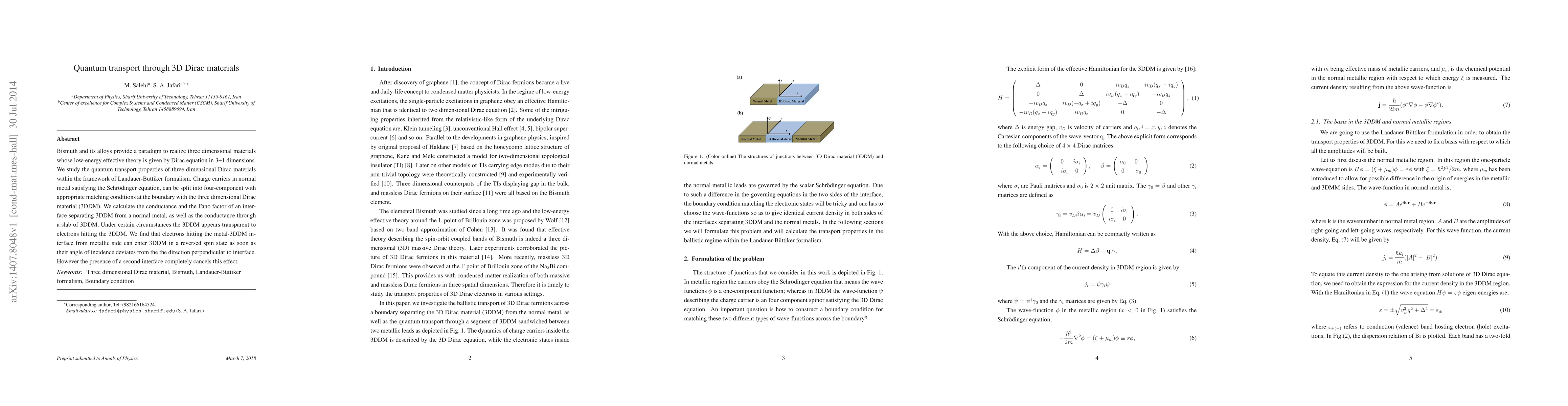 Bismuth and its alloys provide a paradigm to realize three dimensional materials whose low-energy effective theory is given by Dirac equation in 3+1 dimensions. We study the quantum transport properties of three dimensional Dirac materials within the framework of Landauer-B\"uttiker formalism. Charge carriers in normal metal satisfying the Schr\"odinger equation, can be split into four-component with appropriate matching conditions at the boundary with the three dimensional Dirac material (3DDM). We calculate the conductance and the Fano factor of an interface separating 3DDM from a normal metal, as well as the conductance through a slab of 3DDM. Under certain circumstances the 3DDM appears transparent to electrons hitting the 3DDM. We find that electrons hitting the metal-3DDM interface from metallic side can enter 3DDM in a reversed spin state as soon as their angle of incidence deviates from the the direction perpendicular to interface. However the presence of a second interface completely cancels this effect.