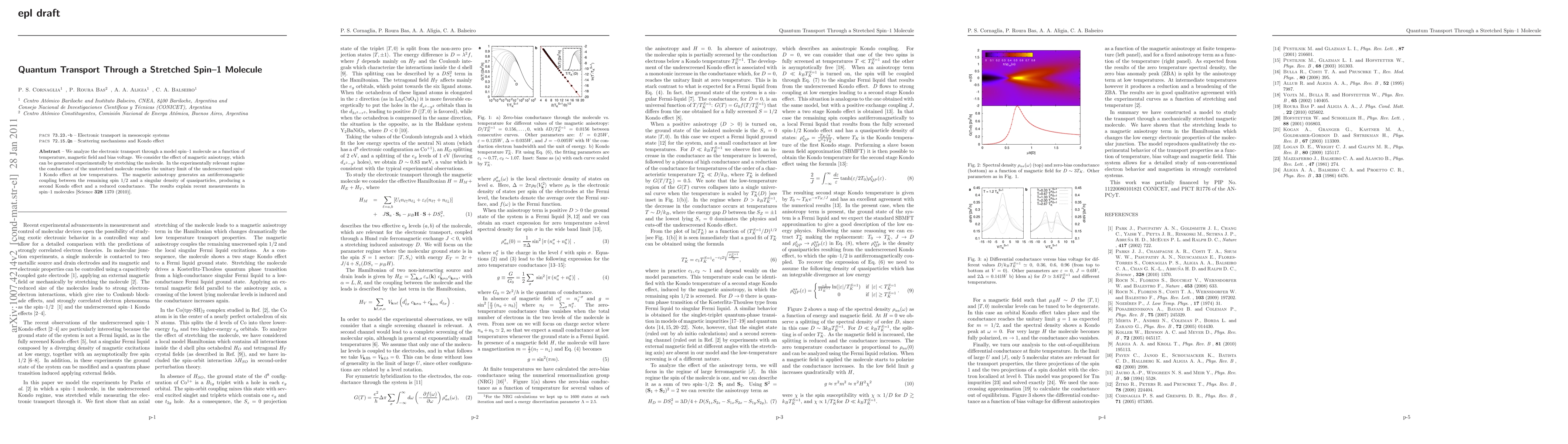 The paper presents a theoretical model and analysis of quantum transport through a stretched spin-1 molecule, explaining the impact of magnetic anisotropy on the Kondo effect and conductance.