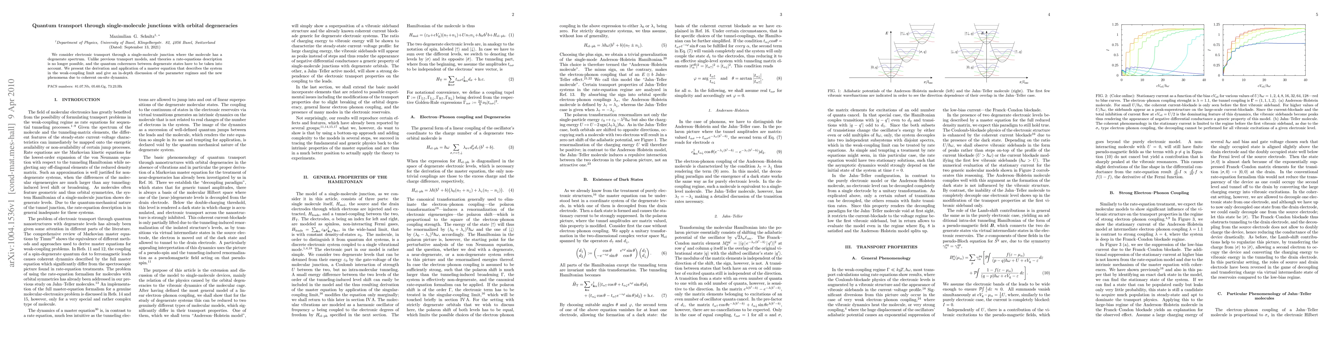 This paper develops a master equation to describe quantum transport through single-molecule junctions with degenerate electronic states, emphasizing the importance of quantum coherences between these states. It explores the weak-coupling limit and discusses the new phenomena arising from the coherent on-site dynamics.