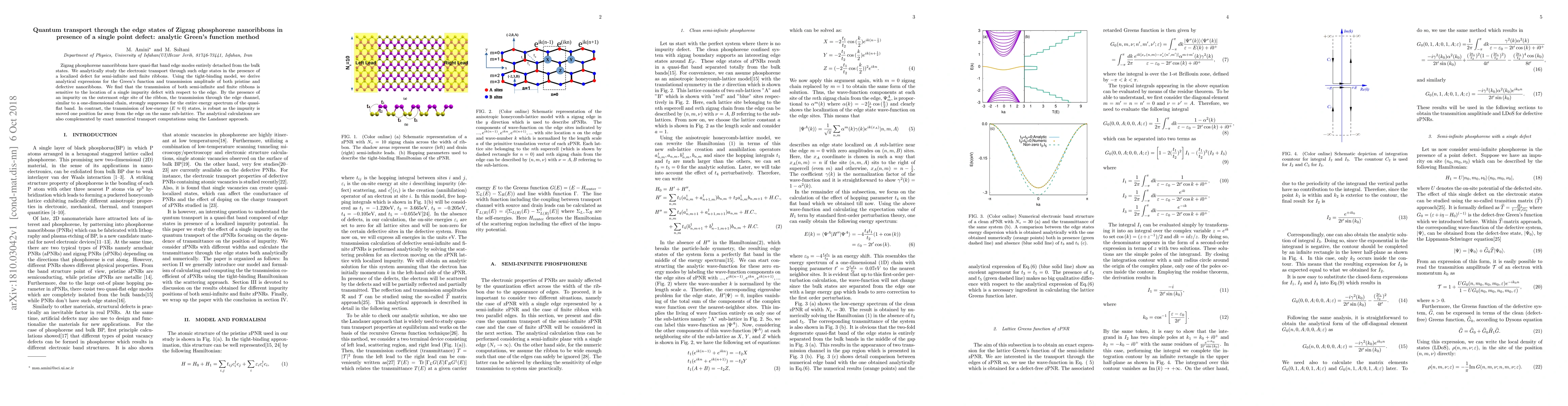 This paper analytically investigates quantum transport through edge states in zigzag phosphorene nanoribbons, revealing that a single point defect significantly alters transmission, especially when located at the outermost edge, which strongly suppresses transport across the quasi-flat band. Numerical computations corroborate the analytical findings.