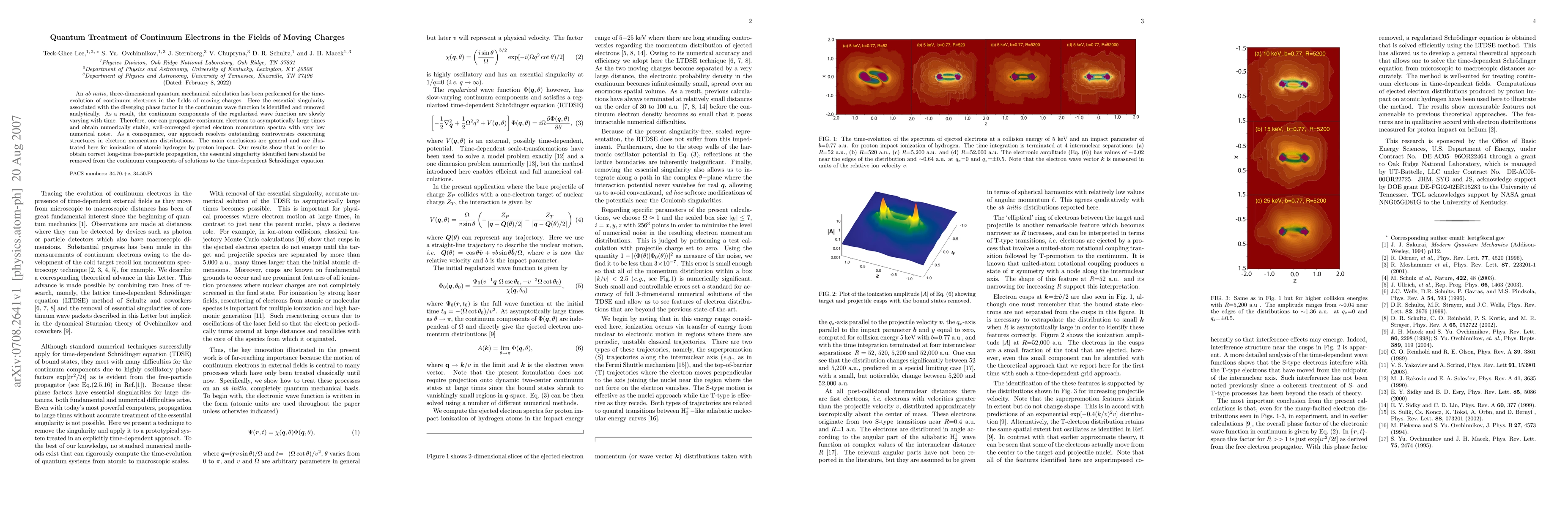 An ab initio, three-dimensional quantum mechanical calculation has been performed for the time-evolution of continuum electrons in the fields of moving charges. Here the essential singularity associated with the diverging phase factor in the continuum wave function is identified and removed analytically. As a result, the continuum components of the regularized wave function are slowly varying with time. Therefore, one can propagate continuum electrons to asymptotically large times and obtain numerically stable, well-converged ejected electron momentum spectra with very low numerical noise. As a consequence, our approach resolves outstanding controversies concerning structures in electron momentum distributions. The main conclusions are general and are illustrated here for ionization of atomic hydrogen by proton impact. Our results show that in order to obtain correct long-time free-particle propagation, the essential singularity identified here should be removed from the continuum components of solutions to the time-dependent Schrodinger equation.