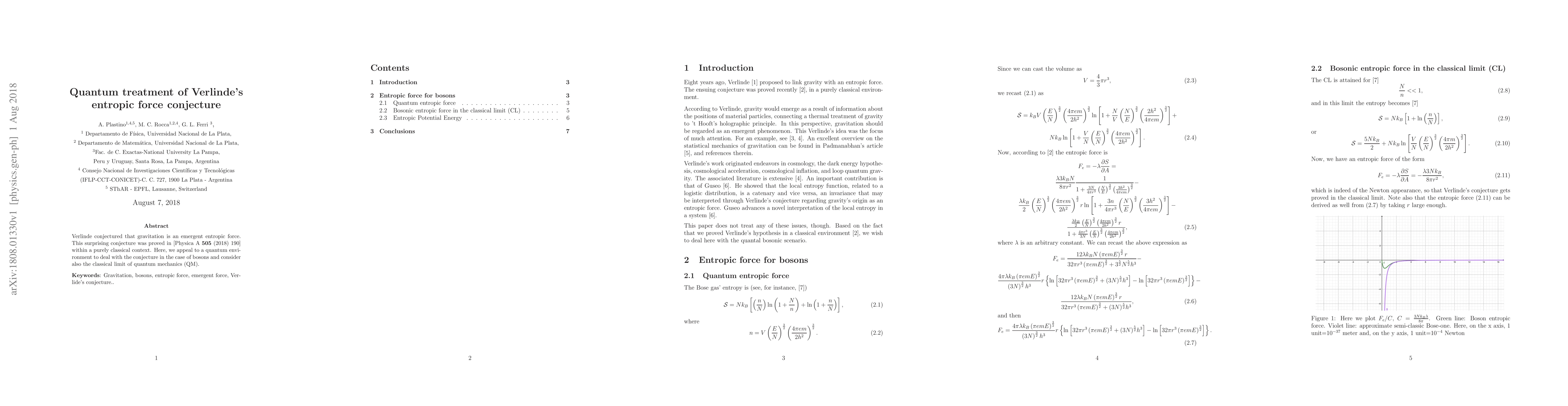 Verlinde conjectured that gravitation is an emergent entropic force. This surprising conjecture was proved in [Physica A {\bf 505} (2018) 190] within a purely classical context. Here, we appeal to a quantum environment to deal with the conjecture in the case of bosons and consider also the classical limit of quantum mechanics (QM).