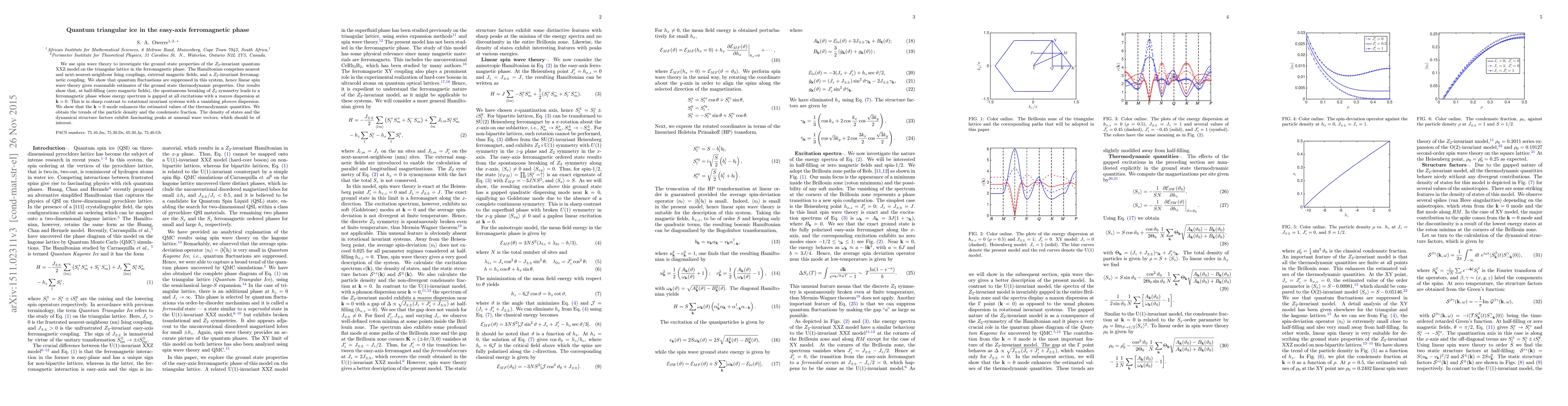 We use spin wave theory to investigate the ground state properties of the $Z_2$-invariant quantum XXZ model on the triangular lattice in the ferromagnetic phase. The Hamiltonian comprises nearest and next-nearest-neighbour Ising couplings, external magnetic fields, and a $Z_2$-invariant ferromagnetic coupling. We show that quantum fluctuations are suppressed in this system, hence linear spin wave theory gives reasonable estimates of the ground state thermodynamic properties. Our results show that, at half-filling (zero magnetic fields), the spontaneous breaking of $Z_2$ symmetry leads to a ferromagnetic phase whose energy spectrum is gapped at all excitations with a maxon dispersion at $\mathbf{k}=0$. This is in sharp contrast to rotational invariant systems with a vanishing phonon dispersion. We show that the $\mathbf{k}=0$ mode enhances the estimated values of the thermodynamic quantities. We obtain the trends of the particle density and the condensate fraction. The density of states and the dynamical structure factors exhibit fascinating peaks at unusual wave vectors, which should be of interest.