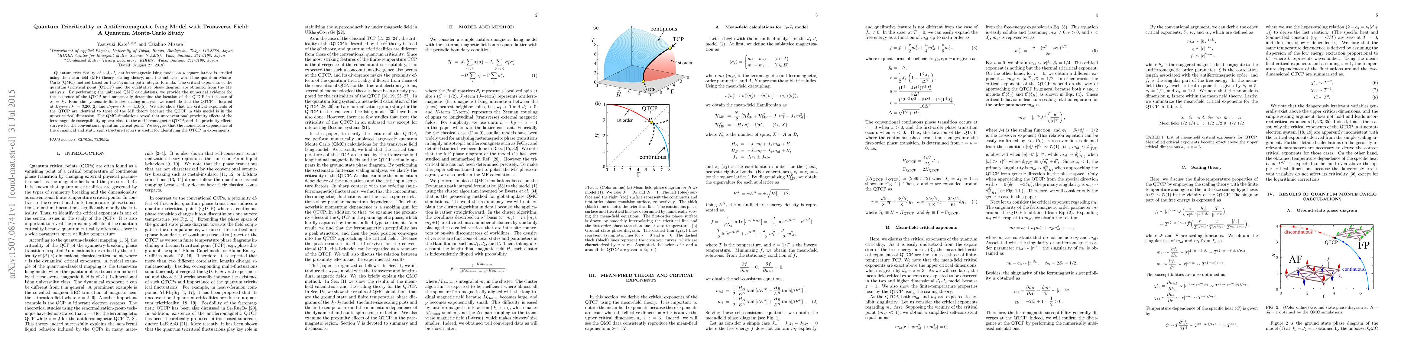 This paper investigates quantum tricriticality in a $J_1$-$J_2$ antiferromagnetic Ising model using quantum Monte-Carlo simulations and mean-field theory. The study finds the quantum tricritical point at $H_{\rm QTCP}/J_1=3.260(2)$ and $\Gamma_{\rm QTCP}/J_1=4.10(5)$, with critical exponents matching the mean-field predictions.