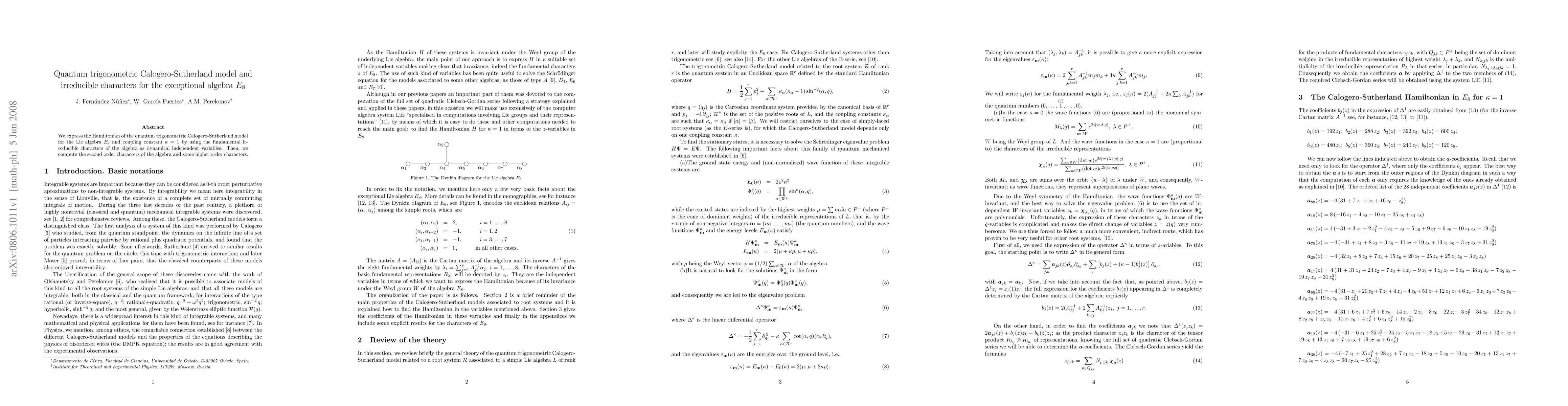Researchers express the quantum trigonometric Calogero-Sutherland model for E8 using fundamental irreducible characters as dynamical variables, computing higher-order characters in the process.