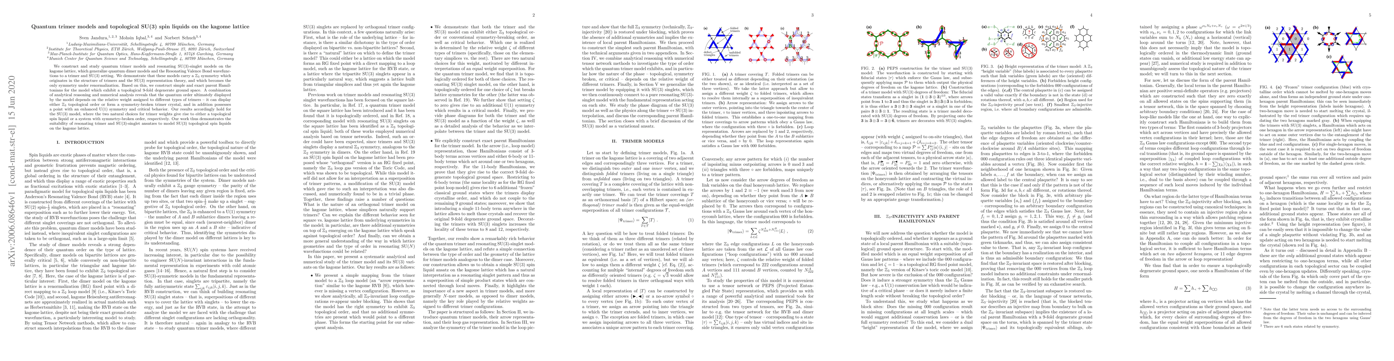 This paper constructs and analyzes quantum trimer models on the kagome lattice, showing that these models exhibit Z_3 topological order or symmetry-broken trimer crystal states depending on trimer weights. The study reveals a topological 9-fold degenerate ground space and critical behavior.