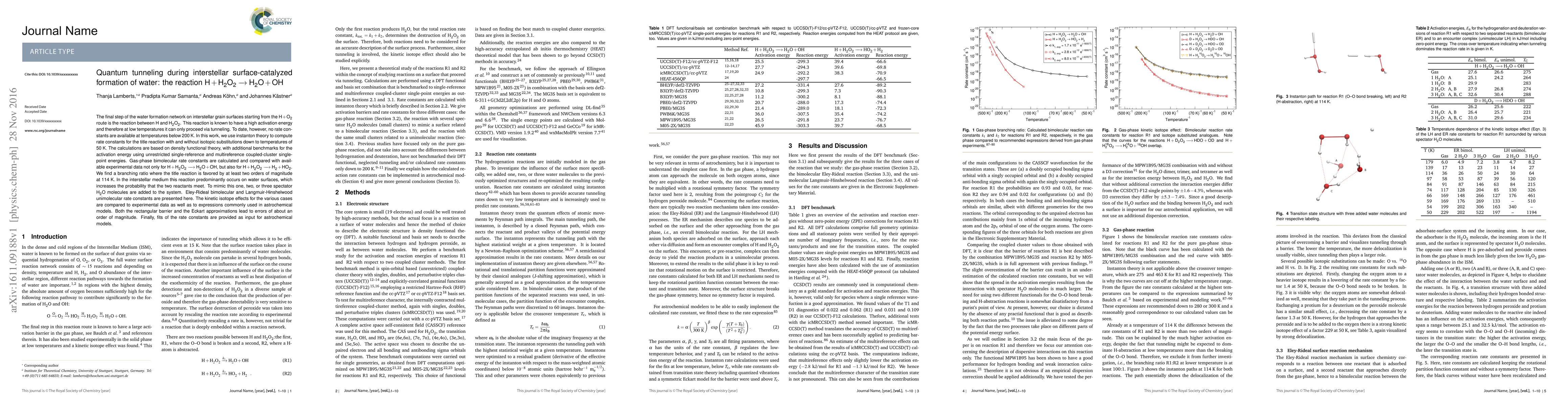 This paper investigates the quantum tunneling mechanism for the reaction H + H$_2$O$_2$ $\rightarrow$ H$_2$O + OH on interstellar grain surfaces, using instanton theory to compute rate constants down to 50 K. The study finds that the reaction is favored by two orders of magnitude at 114 K and provides rate constants for both bimolecular and unimolecular scenarios, including kinetic isotope effects and comparisons to experimental data.