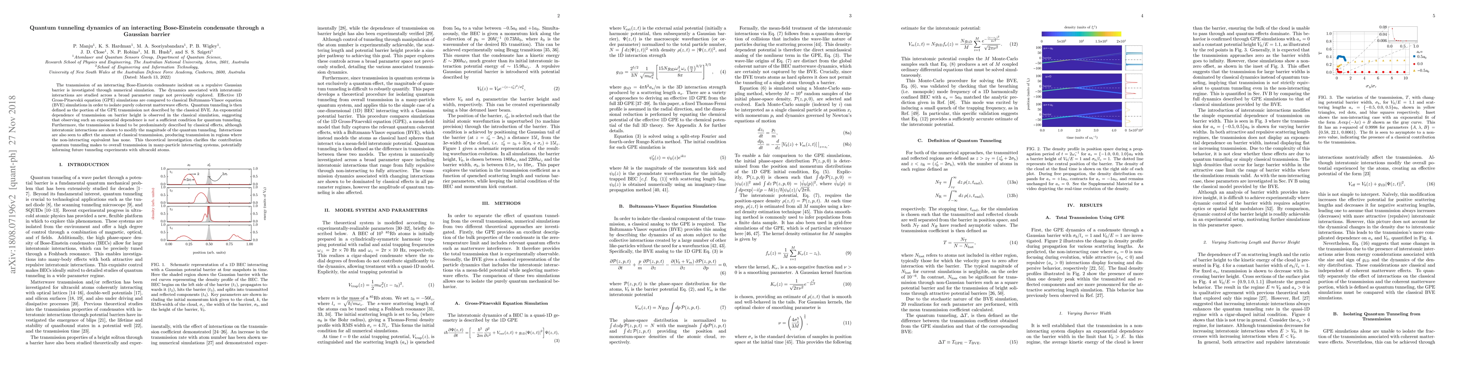 This paper investigates the quantum tunneling dynamics of an interacting Bose-Einstein condensate through a Gaussian barrier using numerical simulations, comparing classical and quantum effects. It finds that while quantum tunneling occurs, classical effects dominate transmission, and interatomic interactions modify both classical and quantum transmission.