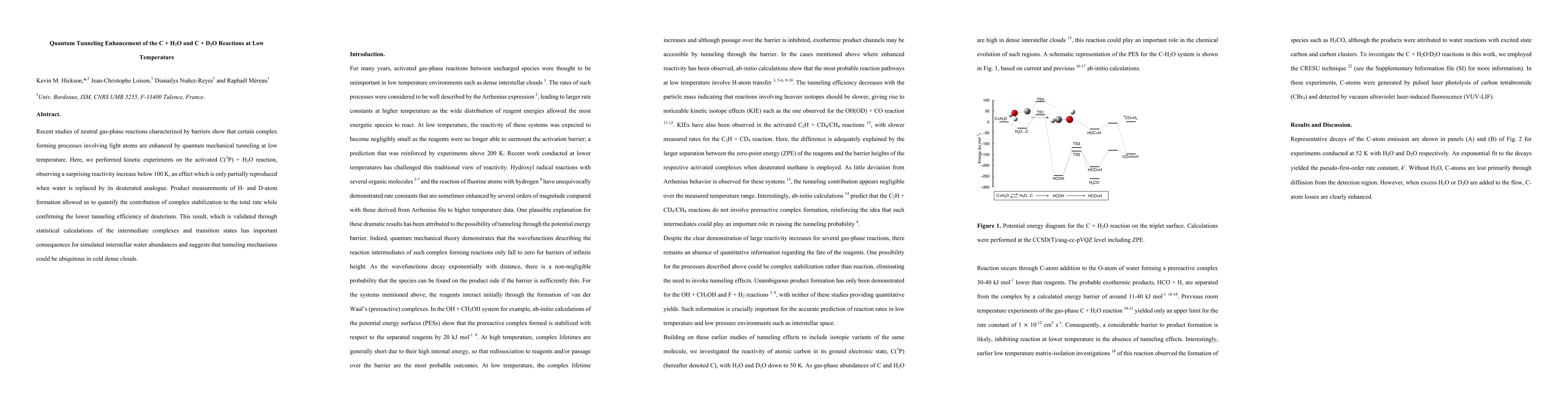Recent studies of neutral gas-phase reactions characterized by barriers show that certain complex forming processes involving light atoms are enhanced by quantum mechanical tunneling at low temperature. Here, we performed kinetic experiments on the activated C(3P) + H2O reaction, observing a surprising reactivity increase below 100 K, an effect which is only partially reproduced when water is replaced by its deuterated analogue. Product measurements of H- and D-atom formation allowed us to quantify the contribution of complex stabilization to the total rate while confirming the lower tunneling efficiency of deuterium. This result, which is validated through statistical calculations of the intermediate complexes and transition states has important consequences for simulated interstellar water abundances and suggests that tunneling mechanisms could be ubiquitous in cold dense clouds.