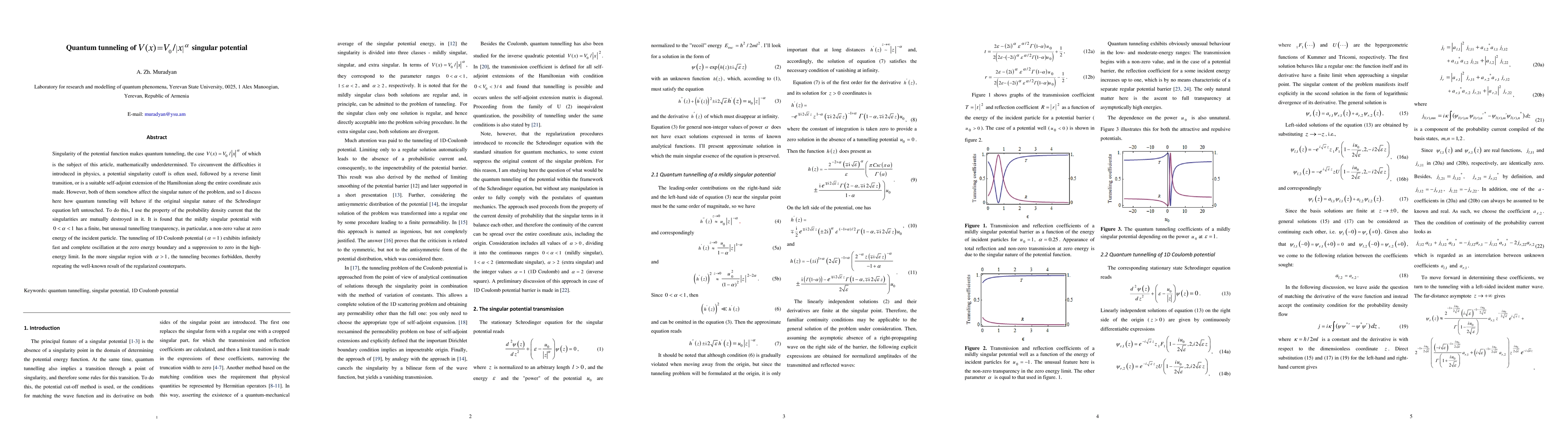 Singularity of the potential function makes quantum tunneling problem mathematically underdetermined. To circumvent the difficulties it introduced in physics, a potential singularity cutoff is often used, followed by a reverse limit transition, or is a suitable self-adjoint extension of the Hamiltonian along the entire coordinate axis made. However, both of them somehow affect the singular nature of the problem, and so I discuss here how quantum tunneling will behave if the original singular nature of the Schrodinger equation left untuched. To do this, I use the property of the probability density current that the singularities are mutually destroyed in it. It is found that the mildly singular potential has a finite, but unusual tunneling transparency, in particular, a non-zero value at zero energy of incident particle. The tunneling of one dimensional Coulomb potential exhibits infinitely fast and complete oscillation at the zero energy boundary and a suppresion to zero in the high-energy limit. In the more singular region, the tunneling becomes forbidden, theby repeating the well-known result of the regularized counterparts.