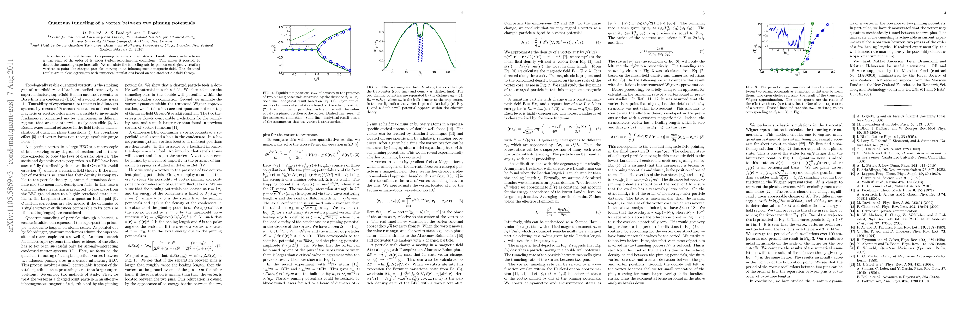 The research demonstrates a vortex tunneling phenomenon between pinning potentials in a Bose-Einstein condensate, observable on a second scale under normal conditions. The tunneling rate is calculated using a point-particle model in an inhomogeneous magnetic field, aligning with simulations from stochastic c-field theory.