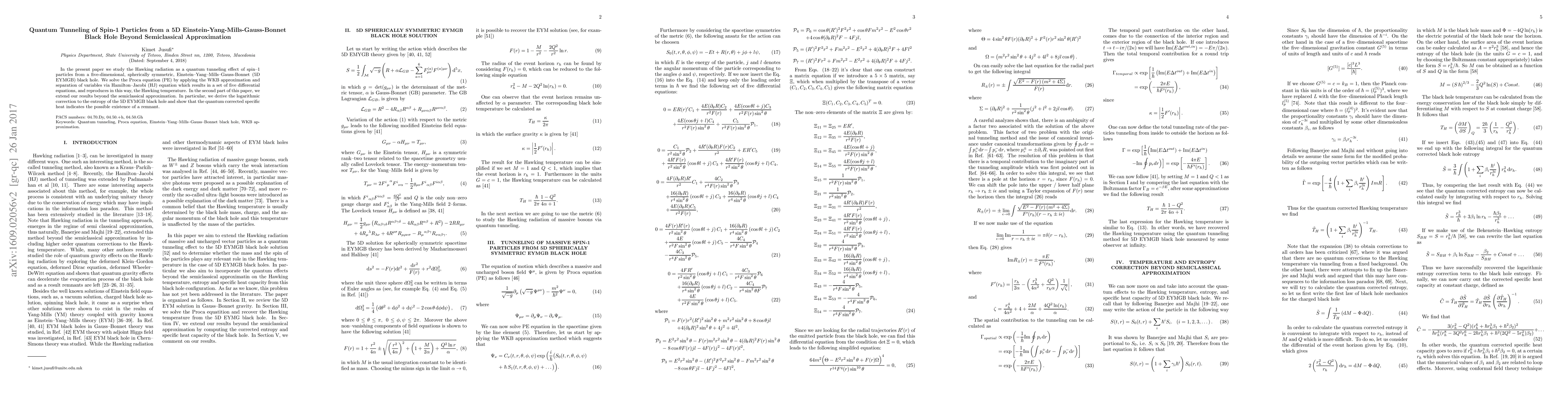 This paper investigates quantum tunneling of spin-1 particles from a 5D Einstein-Yang-Mills-Gauss-Bonnet black hole using the WKB approximation, deriving the Hawking temperature and extending results beyond the semiclassical approximation to include logarithmic corrections to the black hole's entropy and the possibility of a remnant.