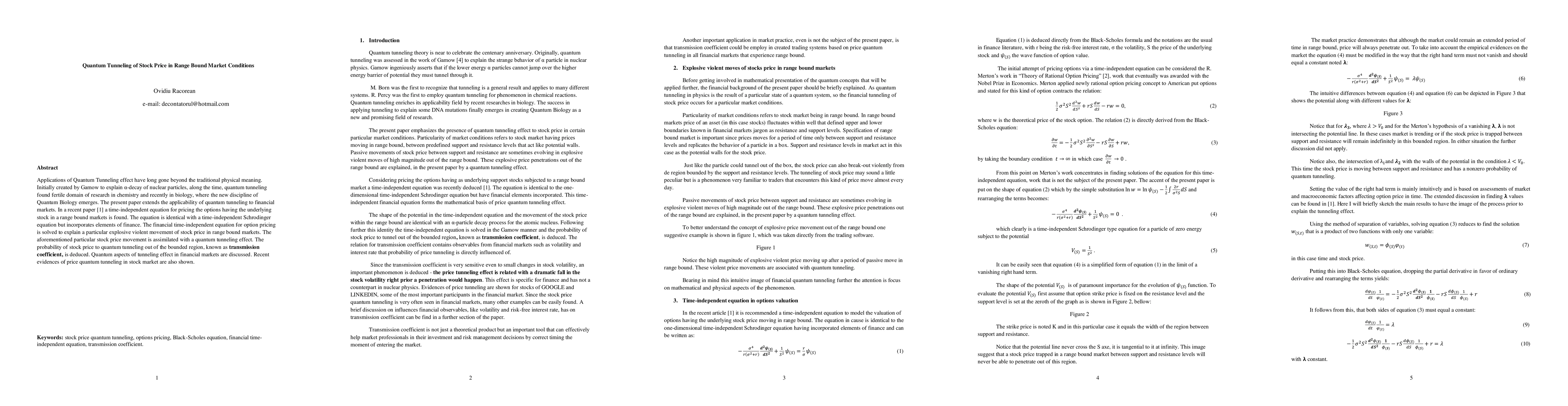 Applications of Quantum Tunneling effect have long gone beyond the traditional physical meaning. Initially created by Gamow to explain {\alpha}-decay of nuclear particles, along the time, quantum tunneling found fertile domain of research in chemistry and recently in biology, where the new discipline of Quantum Biology emerges. The present paper extends the applicability of quantum tunneling to financial markets. In a recent paper [1] a time-independent equation for pricing the options having the underlying stock in a range bound markets is found. The equation is identical with a time-independent Schrodinger equation but incorporates elements of finance. The financial time-independent equation for option pricing is solved to explain a particular explosive violent movement of stock price in range bound markets. The aforementioned particular stock price movement is assimilated with a quantum tunneling effect. The probability of stock price to quantum tunneling out of the bounded region, known as transmission coefficient, is deduced. Quantum aspects of tunneling effect in financial markets are discussed. Recent evidences of price quantum tunneling in stock market are also shown.