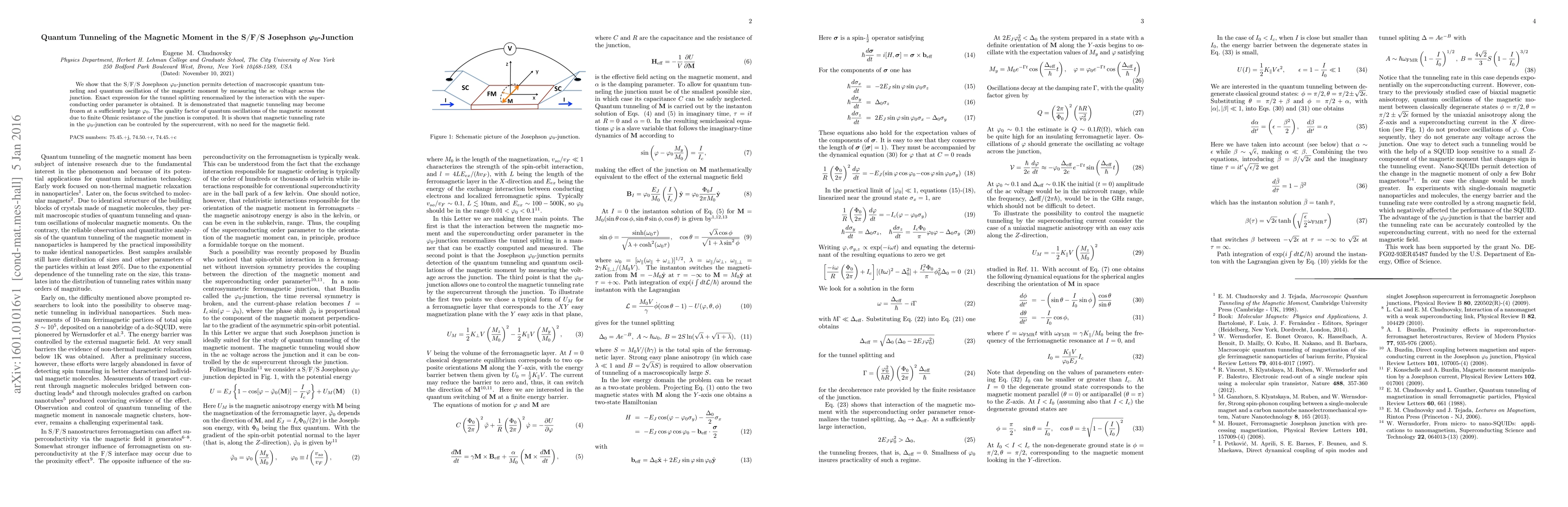We show that the S/F/S Josephson $\varphi_0$-junction permits detection of macroscopic quantum tunneling and quantum oscillation of the magnetic moment by measuring the ac voltage across the junction. Exact expression for the tunnel splitting renormalized by the interaction with the superconducting order parameter is obtained. It is demonstrated that magnetic tunneling may become frozen at a sufficiently large $\varphi_0$. The quality factor of quantum oscillations of the magnetic moment due to finite Ohmic resistance of the junction is computed. It is shown that magnetic tunneling rate in the $\varphi_0$-junction can be controled by the supercurrent, with no need for the magnetic field.