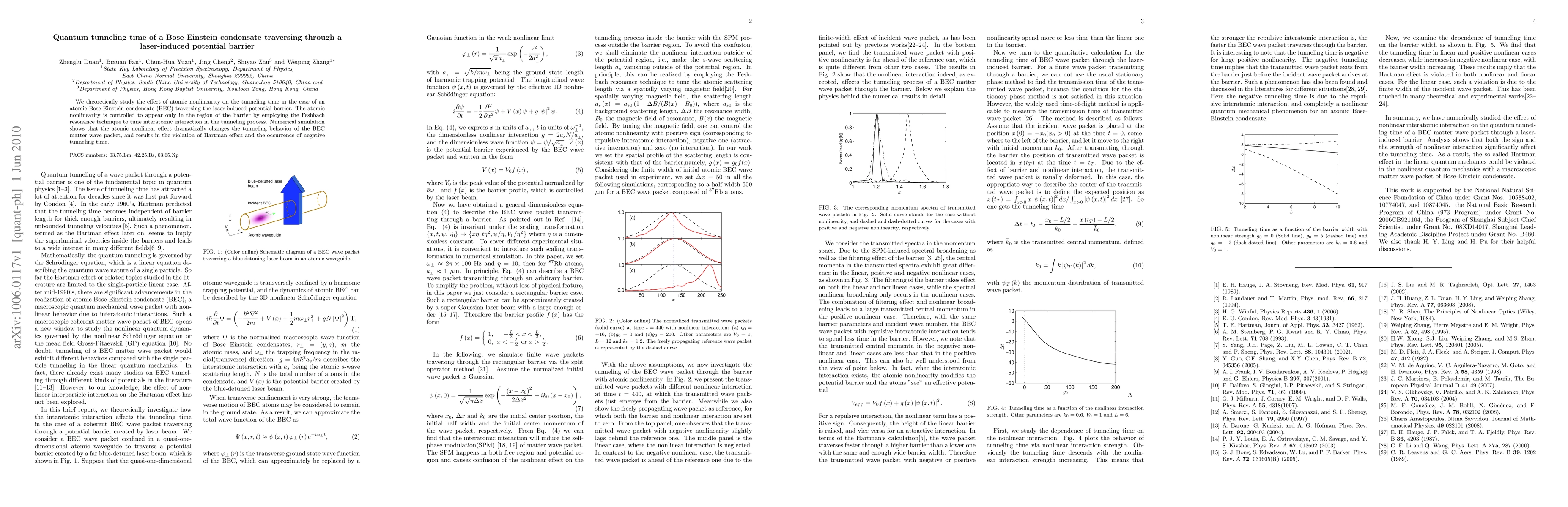 This paper investigates how atomic nonlinearity influences the tunneling time of a Bose-Einstein condensate (BEC) through a laser-induced potential barrier, revealing a violation of the Hartman effect and the emergence of negative tunneling time due to controlled interatomic interactions via Feshbach resonance.