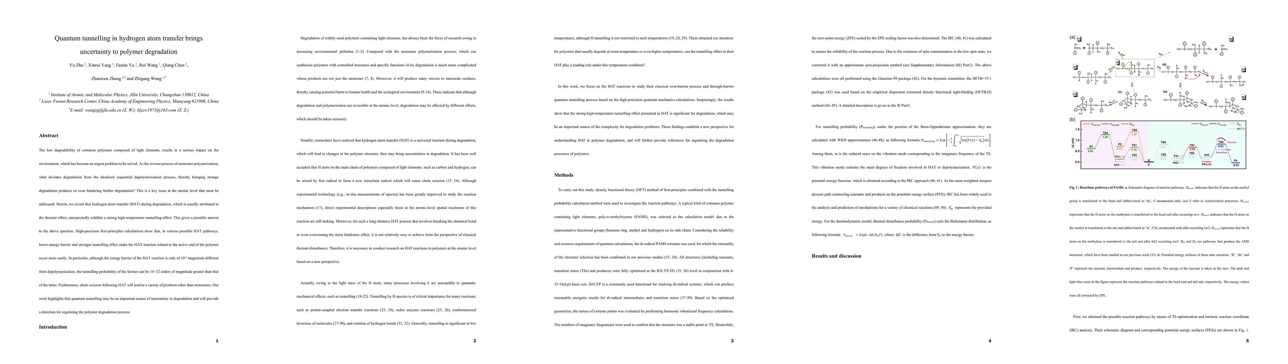 The research reveals that hydrogen atom transfer (HAT) in polymer degradation, often considered a thermal effect, significantly involves quantum tunnelling at high temperatures. This tunnelling effect lowers the energy barrier and increases the probability of HAT reactions, especially at the polymer's active end, leading to diverse degradation products rather than simple monomers. The study suggests that quantum tunnelling could be a key source of variability in polymer degradation, offering potential for regulating this process.