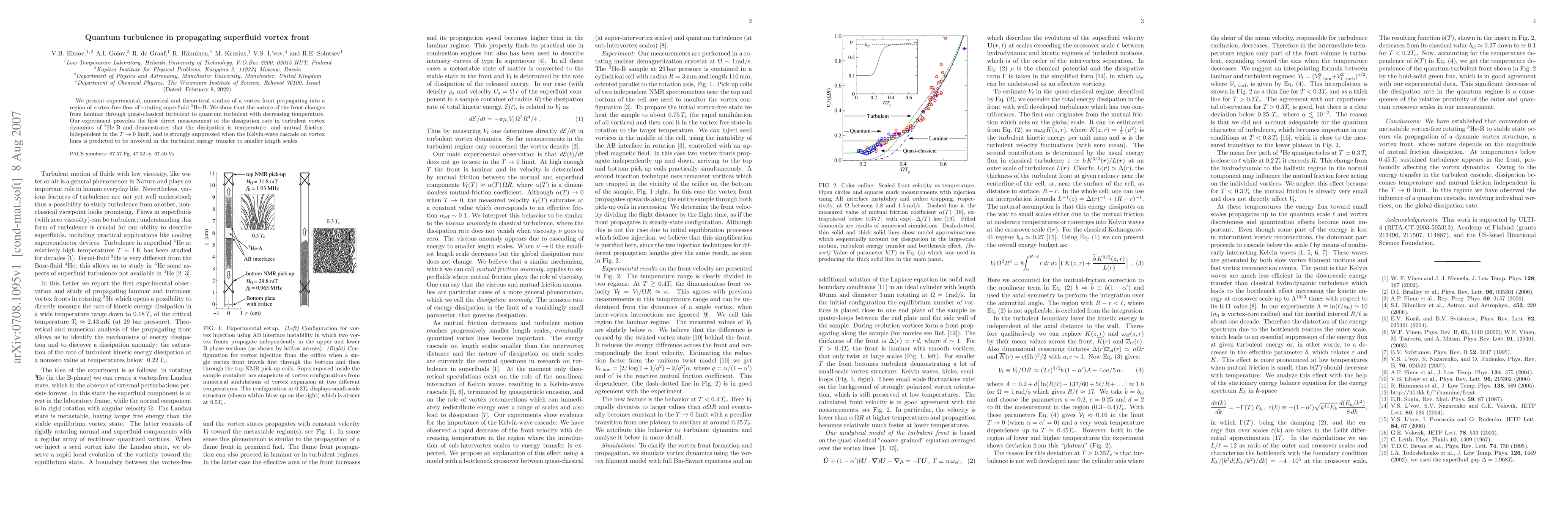 This study investigates the dynamics of a vortex front in superfluid 3He-B, revealing a transition from laminar to quantum turbulence with decreasing temperature. The research provides the first direct measurement of dissipation in turbulent vortex dynamics, showing it is suppressed in the presence of Kelvin waves.