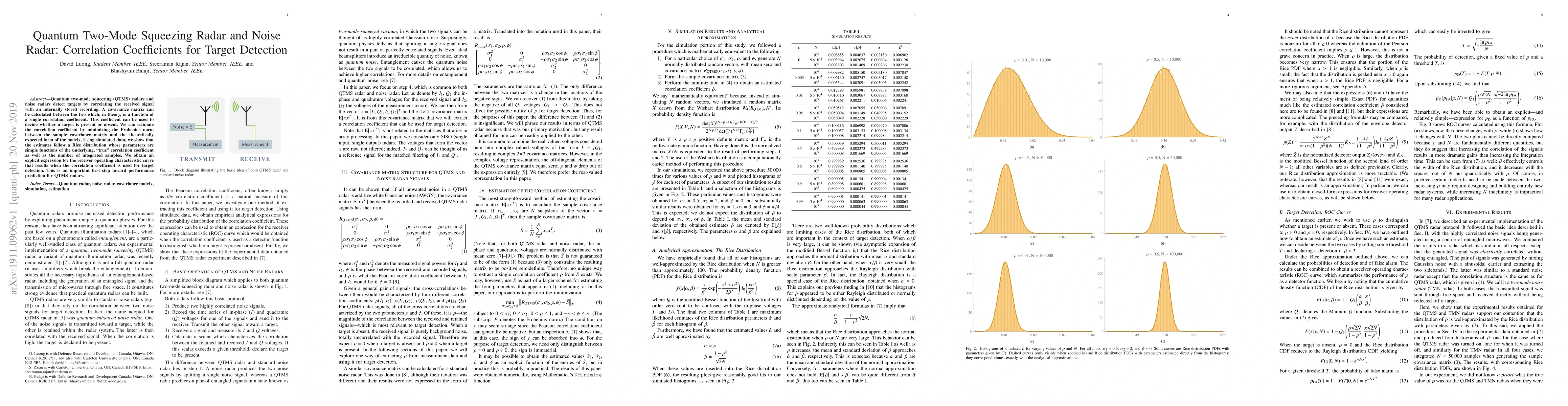 Quantum two-mode squeezing (QTMS) radars and noise radars detect targets by correlating the received signal with an internally stored recording. A covariance matrix can be calculated between the two which, in theory, is a function of a single correlation coefficient. This coefficient can be used to decide whether a target is present or absent. We can estimate the correlation coefficient by minimizing the Frobenius norm between the sample covariance matrix and the theoretically expected form of the matrix. Using simulated data, we show that the estimates follow a Rice distribution whose parameters are simple functions of the underlying, "true" correlation coefficient as well as the number of integrated samples. We obtain an explicit expression for the receiver operating characteristic curve that results when the correlation coefficient is used for target detection. This is an important first step toward performance prediction for QTMS radars.