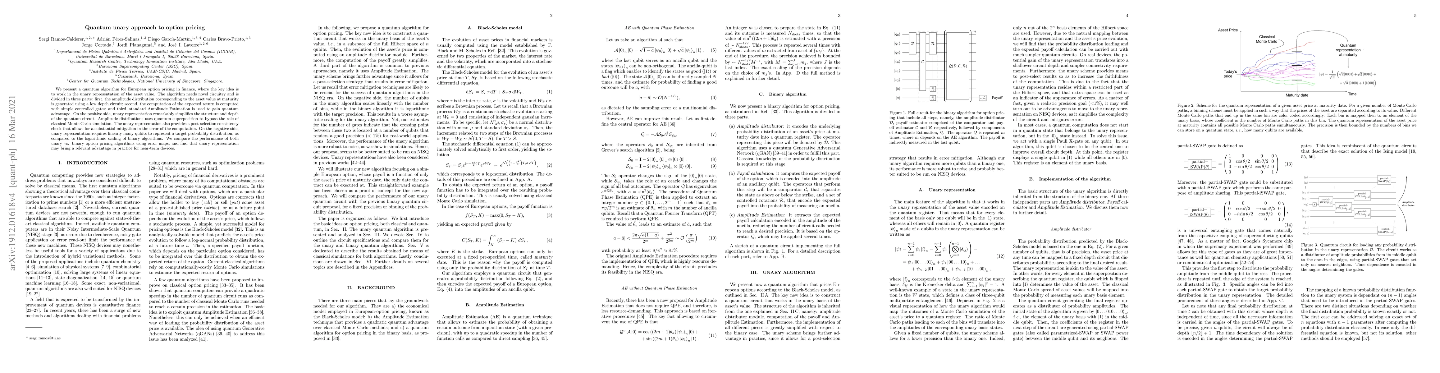 A quantum algorithm uses unary representation to simplify option pricing calculations, offering a potential advantage in near-term devices, but requiring more qubits than binary algorithms.