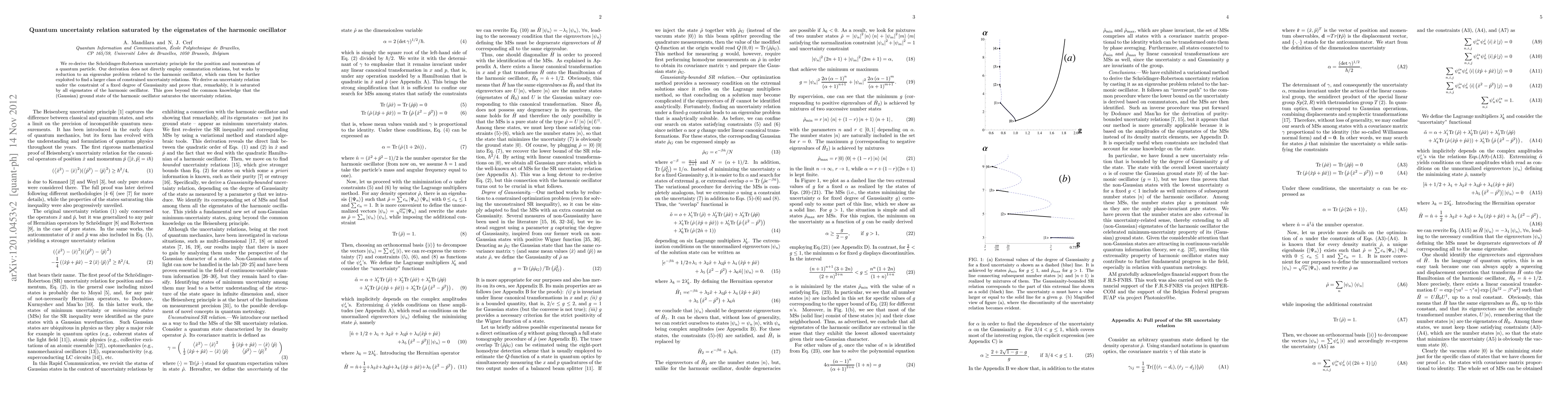 This paper re-derives the Schrödinger-Robertson uncertainty principle through an eigenvalue problem related to the harmonic oscillator, revealing a broader class of constrained uncertainty relations. It demonstrates that all eigenstates of the harmonic oscillator, not just the ground state, saturate the uncertainty relation under a fixed degree of Gaussianity.