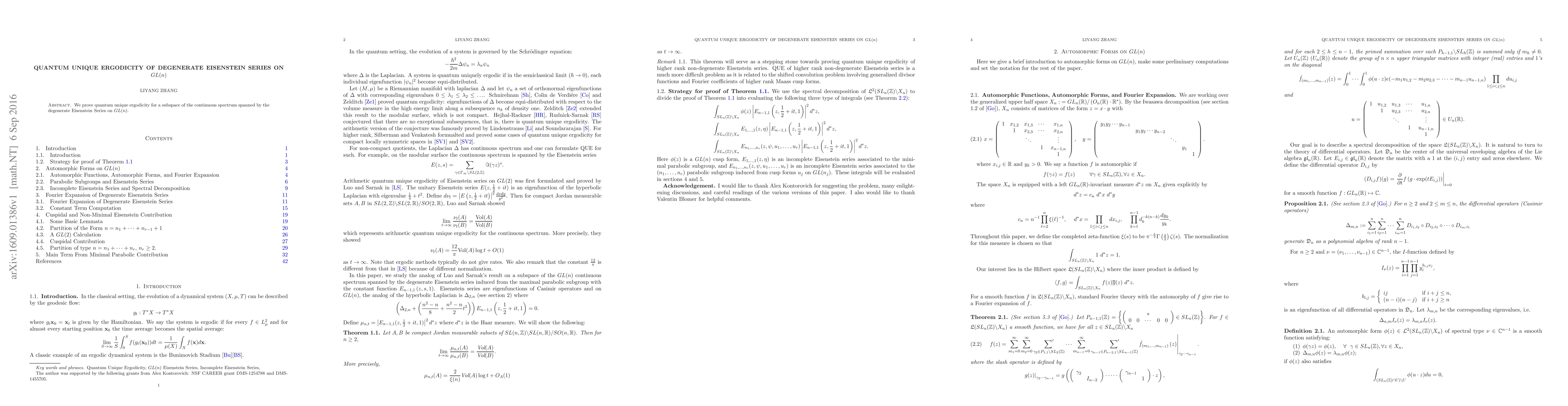 Summary: The paper proves quantum unique ergodicity for a subspace within the continuous spectrum, specifically for degenerate Eisenstein series on the general linear group GL(n). This establishes a unique behavior of these series under quantum operations.