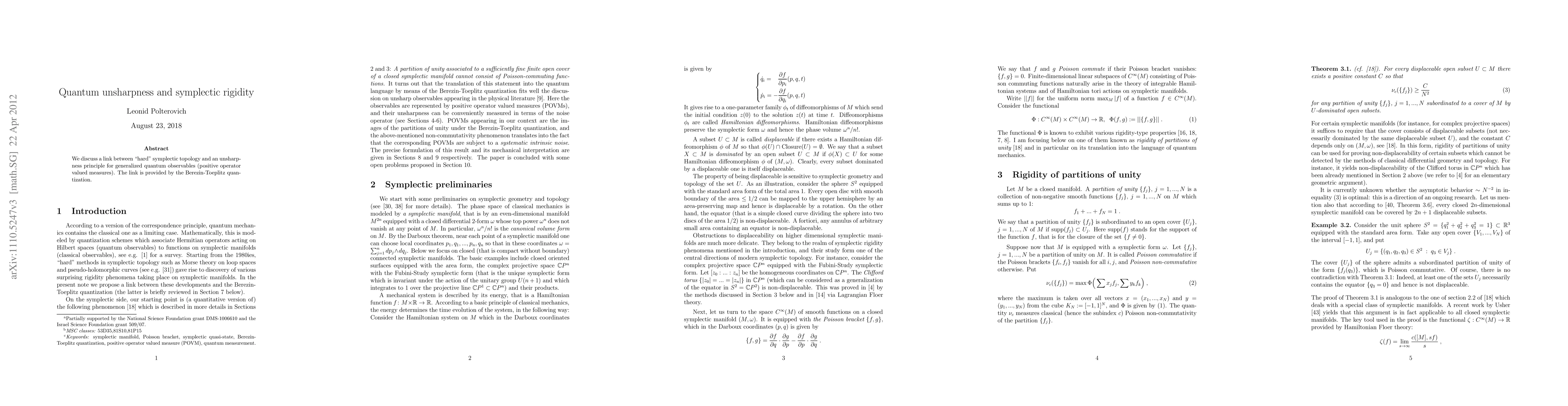 Summary: This paper explores the connection between symplectic topology and quantum unsharpness through the Berezin-Toeplitz quantization, demonstrating how symplectic rigidity influences the nature of generalized quantum observables.