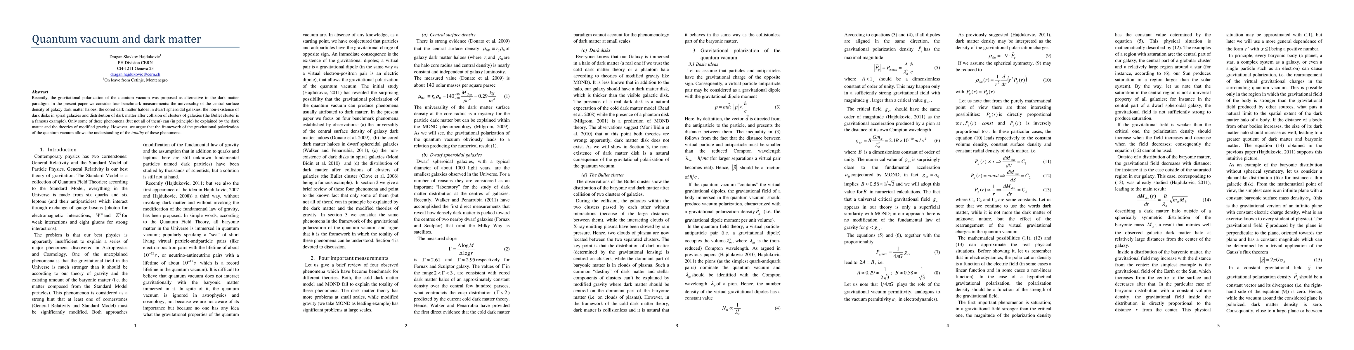 This paper proposes gravitational polarization of the quantum vacuum as an alternative to the dark matter paradigm, arguing that it can explain various galactic phenomena such as the central surface density of dark matter haloes and the Bullet cluster collision, which are traditionally attributed to dark matter.