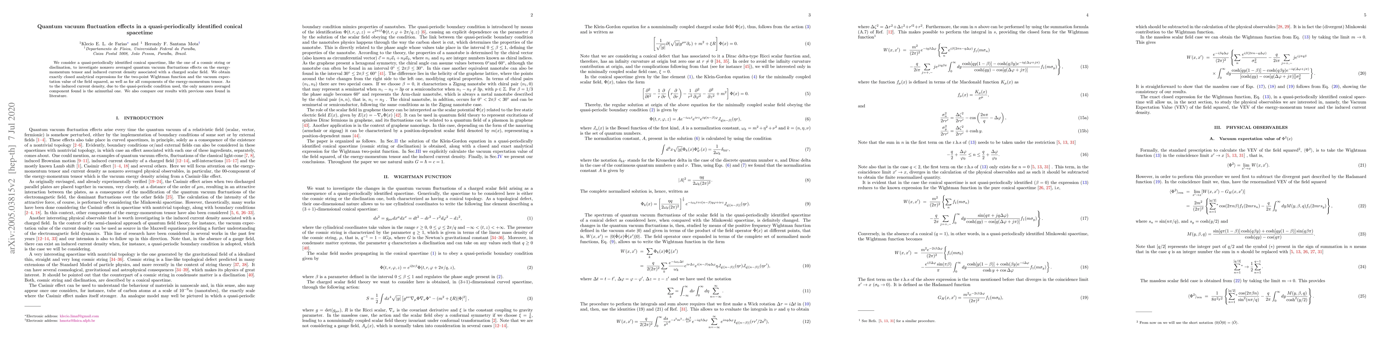This paper investigates quantum vacuum fluctuations in a quasi-periodically identified conical spacetime, deriving analytical expressions for the Wightman function, energy-momentum tensor, and induced current density of a charged scalar field. The study finds the azimuthal component of the induced current density to be the only nonzero average, comparing results with existing literature.
