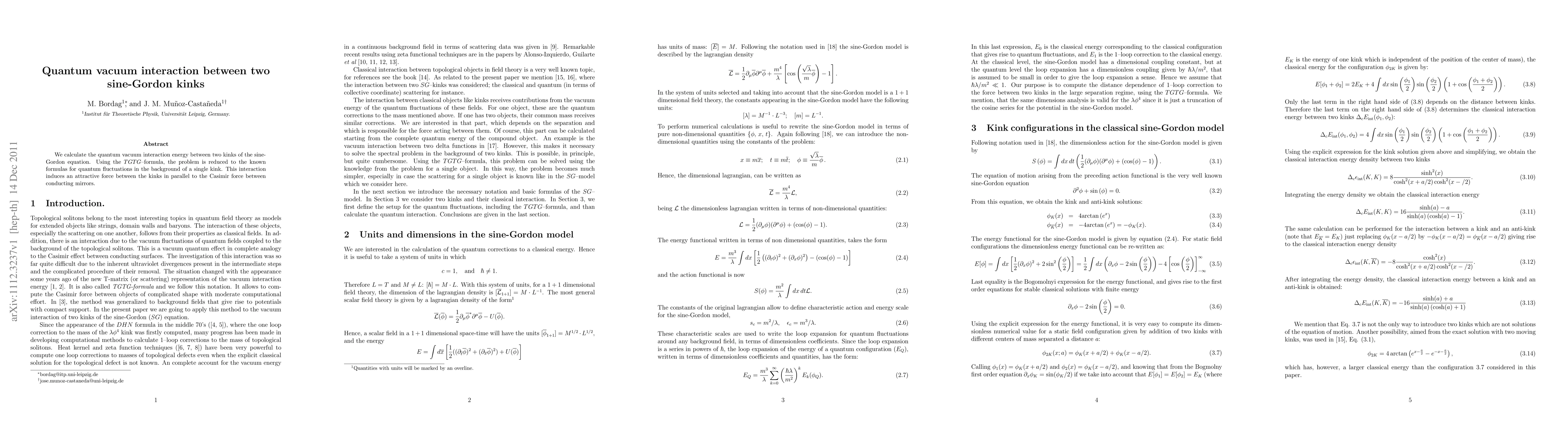 Summary: This paper calculates the quantum vacuum interaction energy between two sine-Gordon kinks, showing that the interaction induces an attractive force akin to the Casimir effect, using the $TGTG$--formula to simplify the problem.