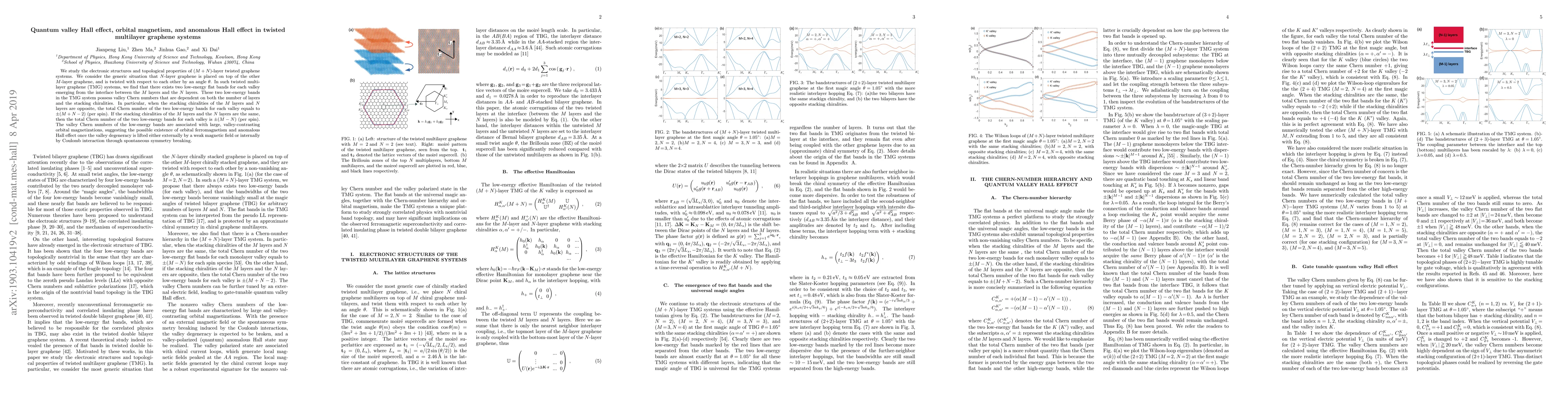 This research investigates the electronic structures and topological properties in twisted multilayer graphene systems, revealing two low-energy flat bands with valley Chern numbers dependent on layer stacking chiralities. The study suggests potential for orbital ferromagnetism and an anomalous Hall effect due to valley-contrasting orbital magnetizations.