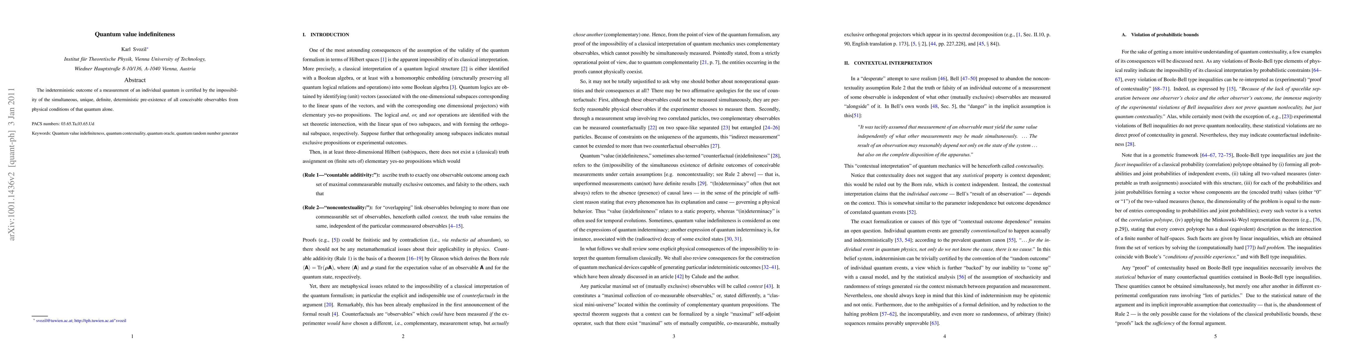 The indeterministic outcome of a measurement of an individual quantum is certified by the impossibility of the simultaneous, definite, deterministic pre-existence of all conceivable observables from physical conditions of that quantum alone. We discuss possible interpretations and consequences for quantum oracles.