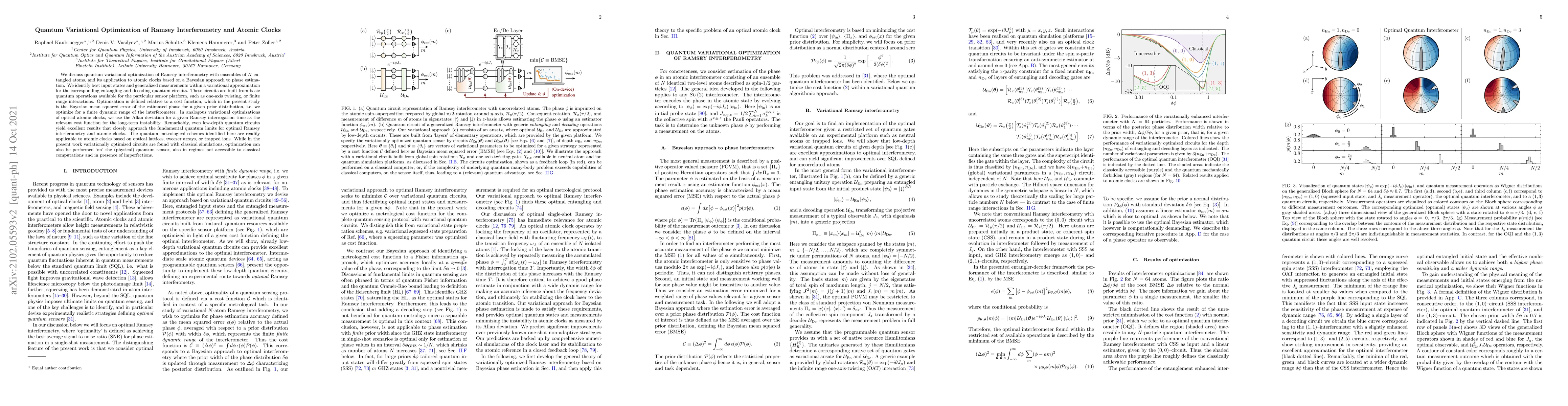 This paper explores quantum variational optimization for Ramsey interferometry using entangled atom ensembles, optimizing for phase estimation in atomic clocks via Bayesian mean square error. It identifies optimal states and measurements for quantum circuits, achieving near-optimal performance with low-depth circuits.