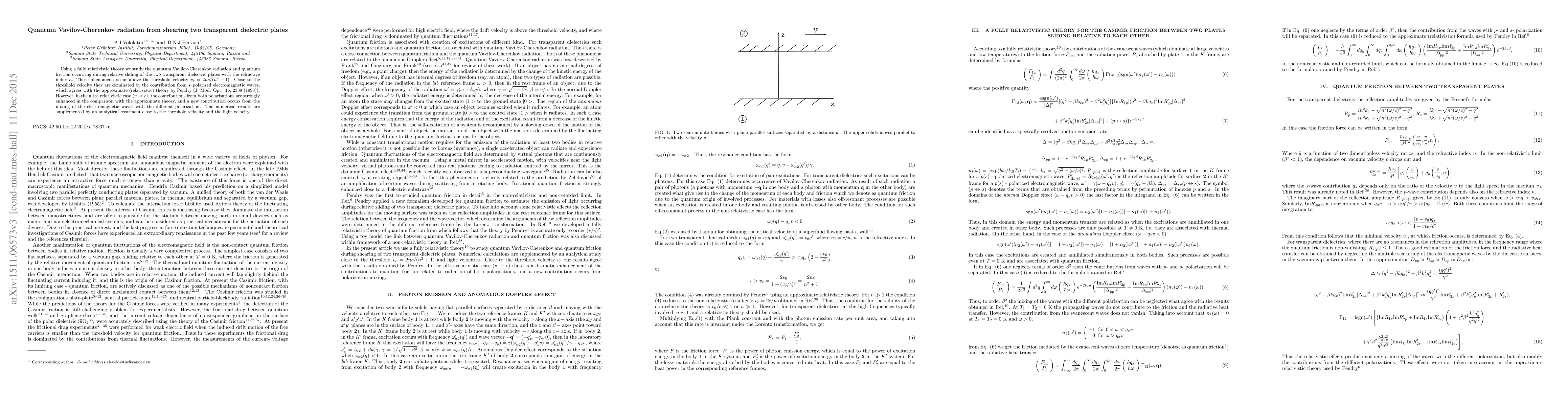 This paper investigates quantum Vavilov-Cherenkov radiation and quantum friction during the relative sliding of two transparent dielectric plates, revealing enhanced contributions from both polarizations in ultra-relativistic conditions compared to approximate theories. Analytical and numerical results are provided for both threshold and light velocities.