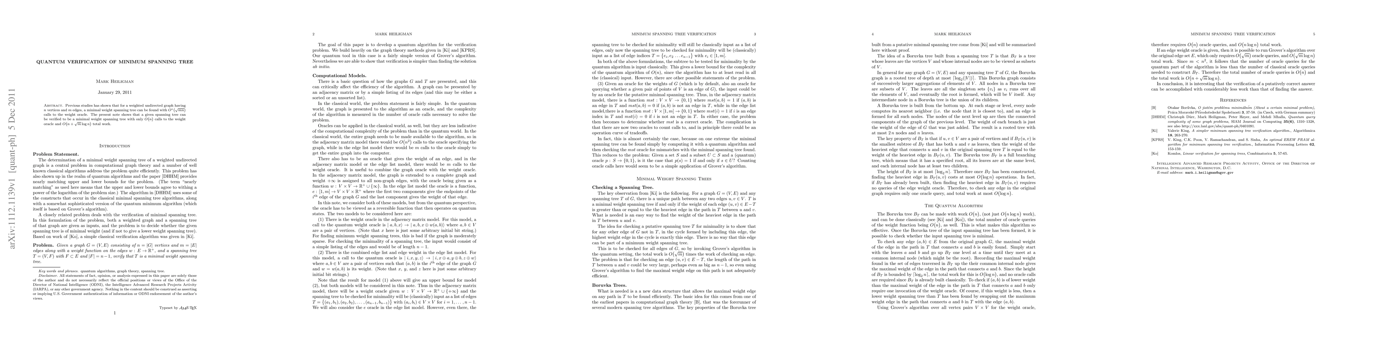 Researchers have developed a method to verify if a given spanning tree is the minimum weight spanning tree for a graph with $n$ vertices and $m$ edges, requiring only $O(n)$ calls to the weight oracle and $O(n+ ext{sqrt}(m) ext{log} n)$ total work.