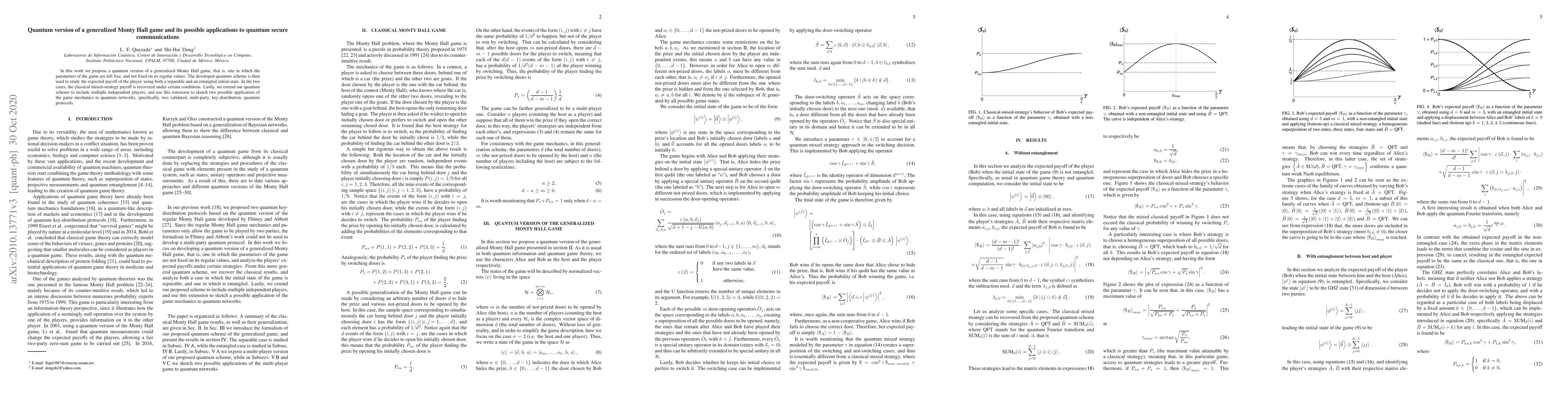 This paper proposes a quantum version of a generalized Monty Hall game, exploring its expected payoff under separable and entangled states. It extends the scheme to multiple players and outlines its potential applications in quantum secure communications, specifically in multi-party key distribution protocols.