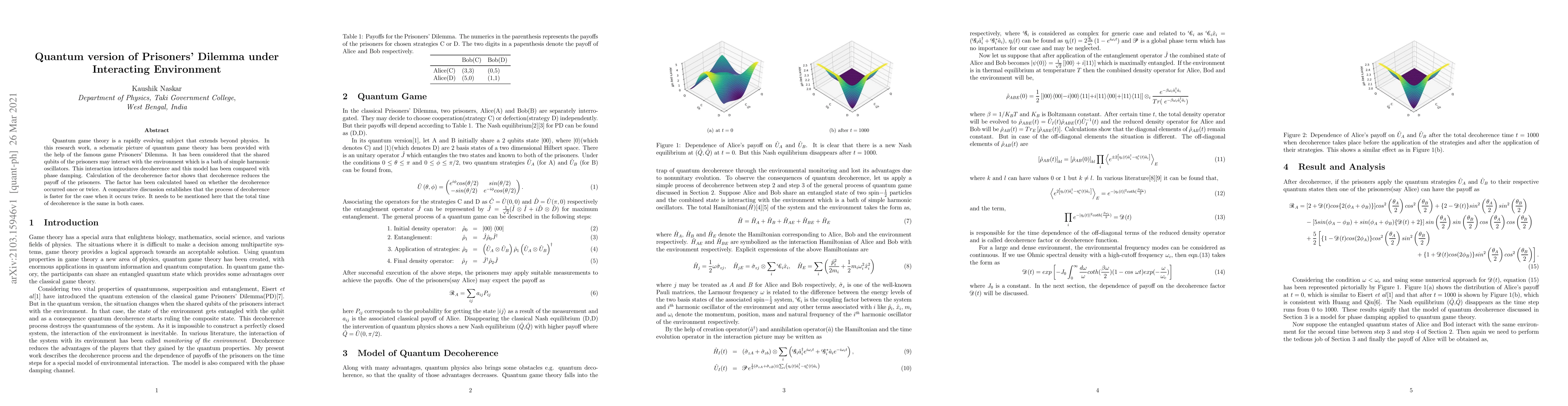 This paper explores quantum game theory through the quantum version of the Prisoners' Dilemma, where shared qubits of the prisoners interact with an environment modeled as a bath of harmonic oscillators. The study finds that decoherence, introduced by this interaction, reduces the payoff for the prisoners, with faster decoherence observed when it occurs twice despite the total decoherence time remaining constant.