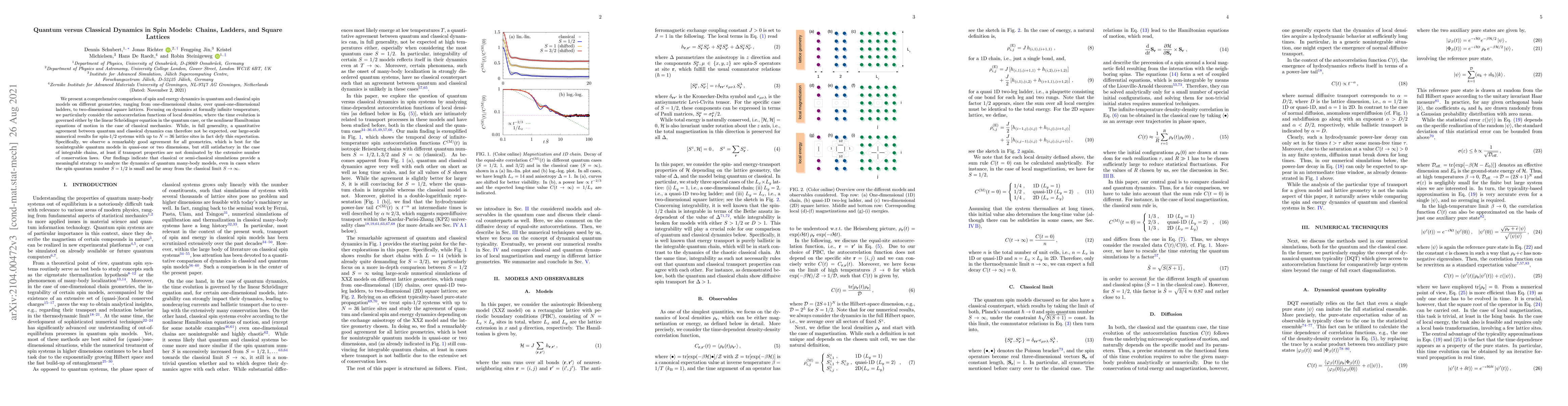 Researchers compare quantum and classical dynamics in spin models on chains, ladders, and square lattices, finding surprisingly good agreement for certain geometries and small spin systems.