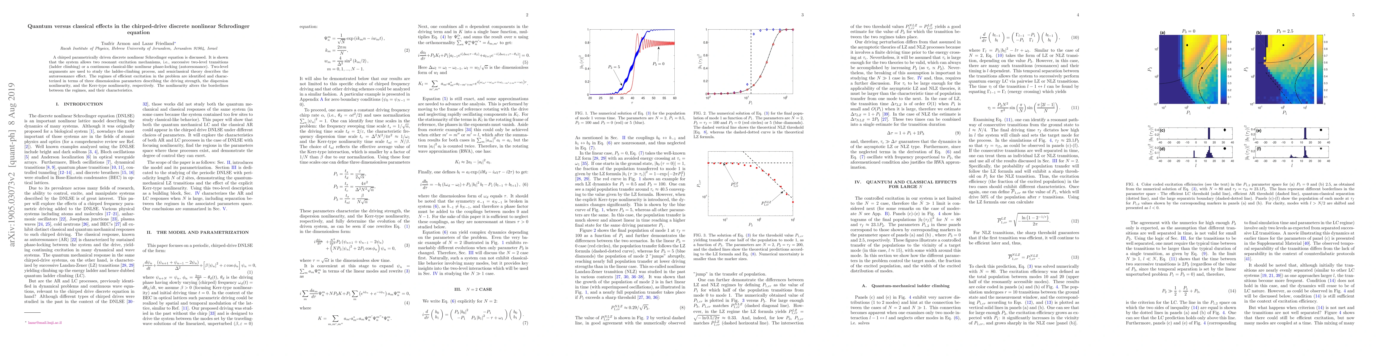A chirped parametrically driven discrete nonlinear Schrodinger equation is discussed. It is shown that the system allows two resonant excitation mechanisms, i.e., successive two-level transitions (ladder climbing) or a continuous classical-like nonlinear phase-locking (autoresonance). Two-level arguments are used to study the ladder-climbing process, and semiclassical theory describes the autoresonance effect. The regimes of efficient excitation in the problem are identified and characterized in terms of three dimensionless parameters describing the driving strength, the dispersion nonlinearity, and the Kerr-type nonlinearity, respectively. The nonlinearity alters the borderlines between the regimes, and their characteristics.