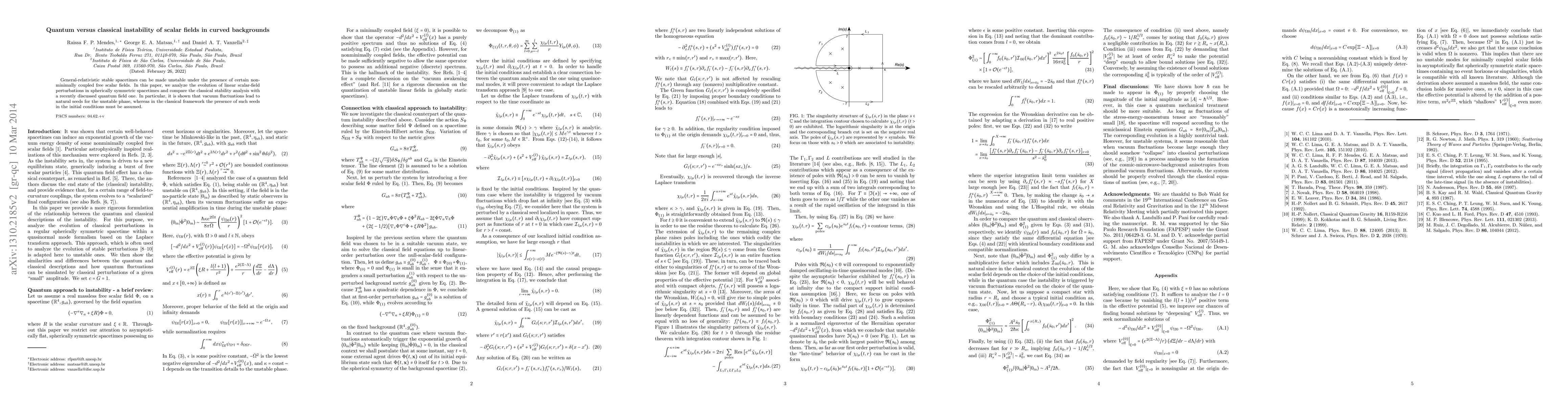 General-relativistic stable spacetimes can be made unstable under the presence of certain nonminimally coupled free scalar fields. In this paper, we analyze the evolution of linear scalar-field perturbations in spherically symmetric spacetimes and compare the classical stability analysis with a recently discussed quantum field one. In particular, it is shown that vacuum fluctuations lead to natural seeds for the unstable phase, whereas in the classical framework the presence of such seeds in the initial conditions must be assumed.