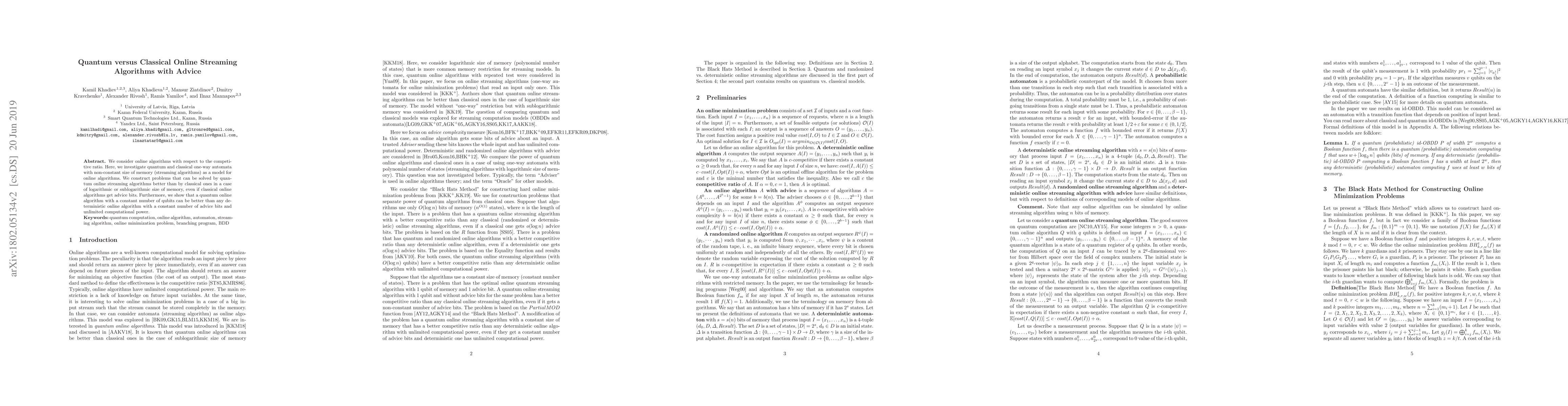 This paper explores the performance differences between quantum and classical online streaming algorithms, demonstrating that quantum algorithms can outperform classical ones, particularly with logarithmic or sublogarithmic memory sizes, even when the latter have advice bits. It also concludes that a quantum algorithm with a limited number of qubits can surpass any deterministic classical algorithm with advice, regardless of computational power.