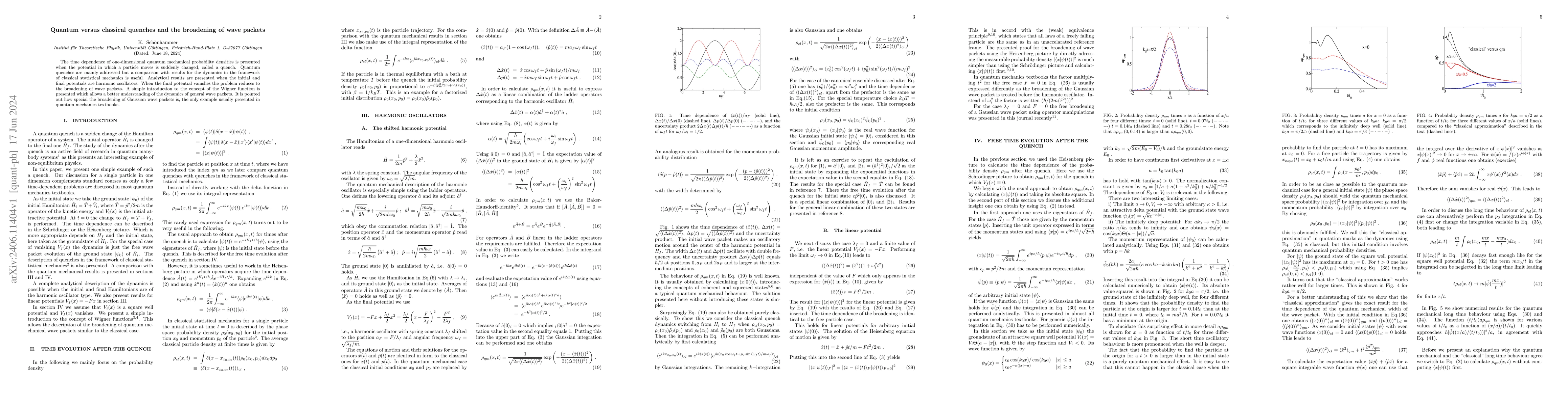 The time dependence of one-dimensional quantum mechanical probability densities is presented when the potential in which a particle moves is suddenly changed, called a quench. Quantum quenches are mainly addressed but a comparison with results for the dynamics in the framework of classical statistical mechanics is useful. Analytical results are presented when the initial and final potentials are harmonic oscillators. When the final potential vanishes the problem reduces to the broadening of wave packets. A simple introduction to the concept of the Wigner function is presented which allows a better understanding of the dynamics of general wave packets. It is pointed out how special the broadening of Gaussian wave packets is, the only example usually presented in quantum mechanics textbooks.