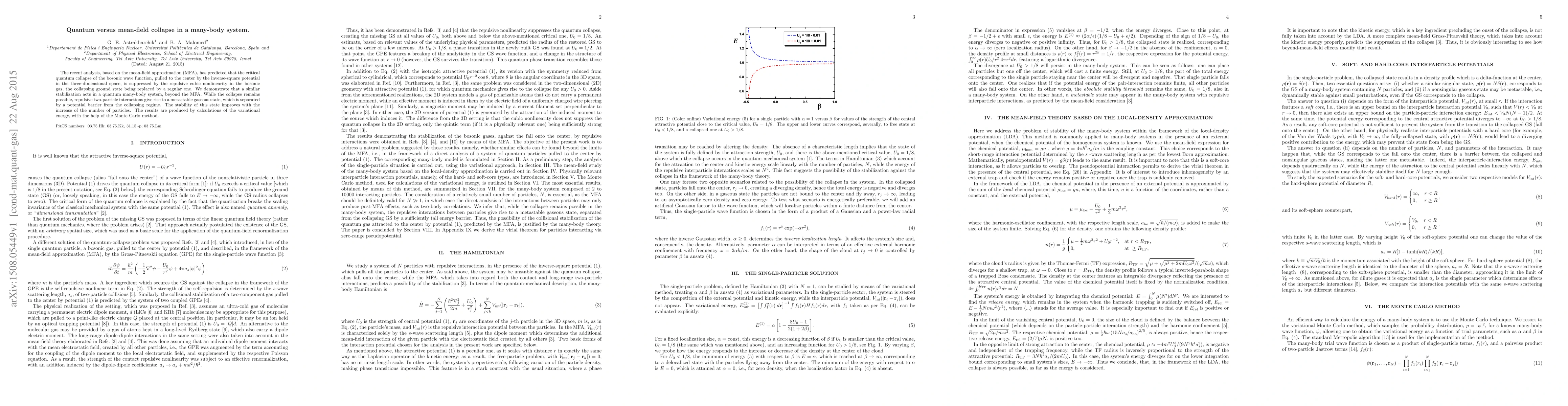 The recent analysis, based on the mean-field approximation (MFA), has predicted that the critical quantum collapse of the bosonic wave function, pulled to the center by the inverse-square potential in the three-dimensional space, is suppressed by the repulsive cubic nonlinearity in the bosonic gas, the collapsing ground state being replaced by a regular one. We demonstrate that a similar stabilization acts in a quantum many-body system, beyond the MFA. While the collapse remains possible, repulsive two-particle interactions give rise to a metastable gaseous state, which is separated by a potential barrier from the collapsing regime. The stability of this state improves with the increase of the number of particles. The results are produced by calculations of the variational energy, with the help of the Monte Carlo method.